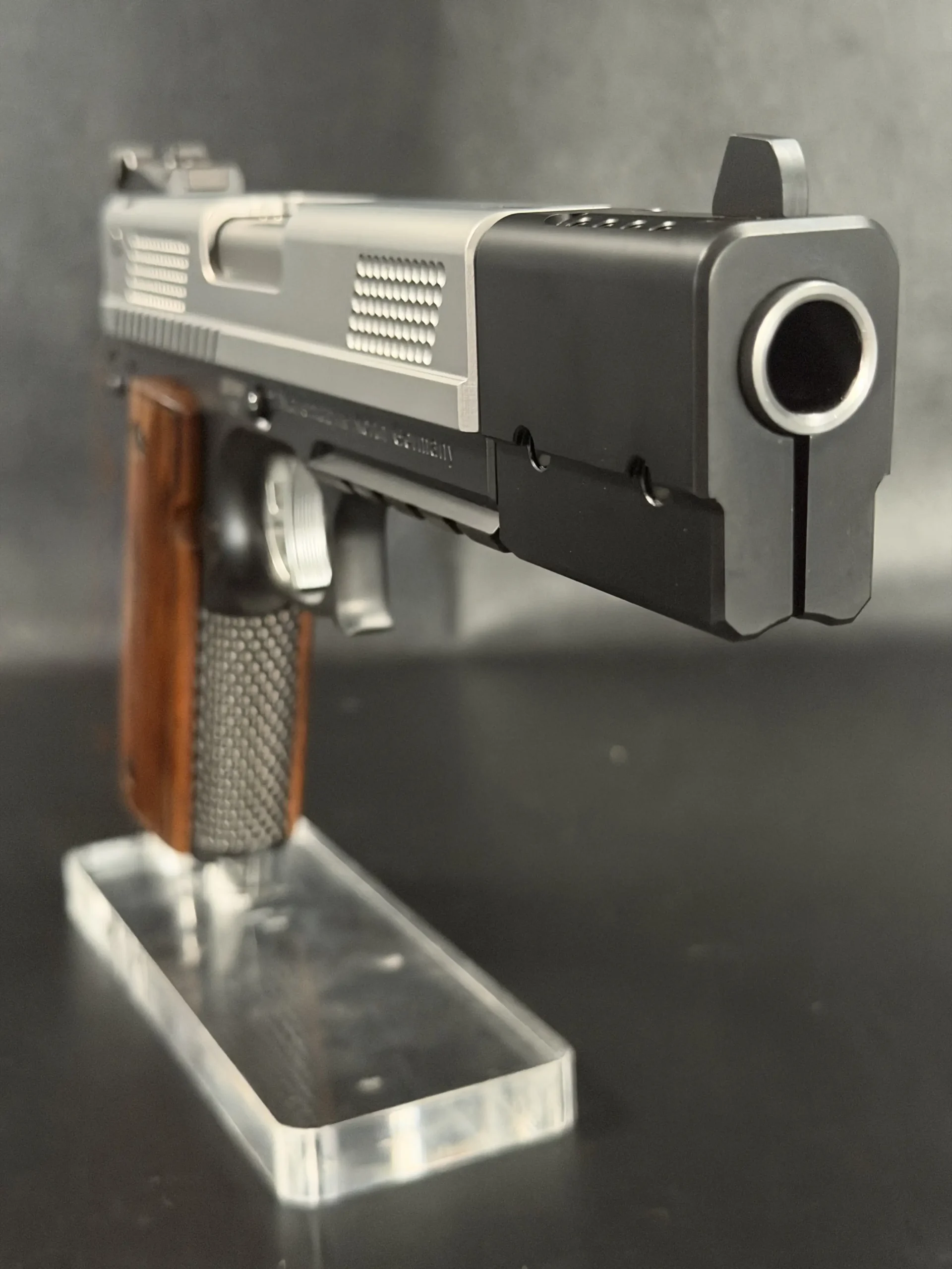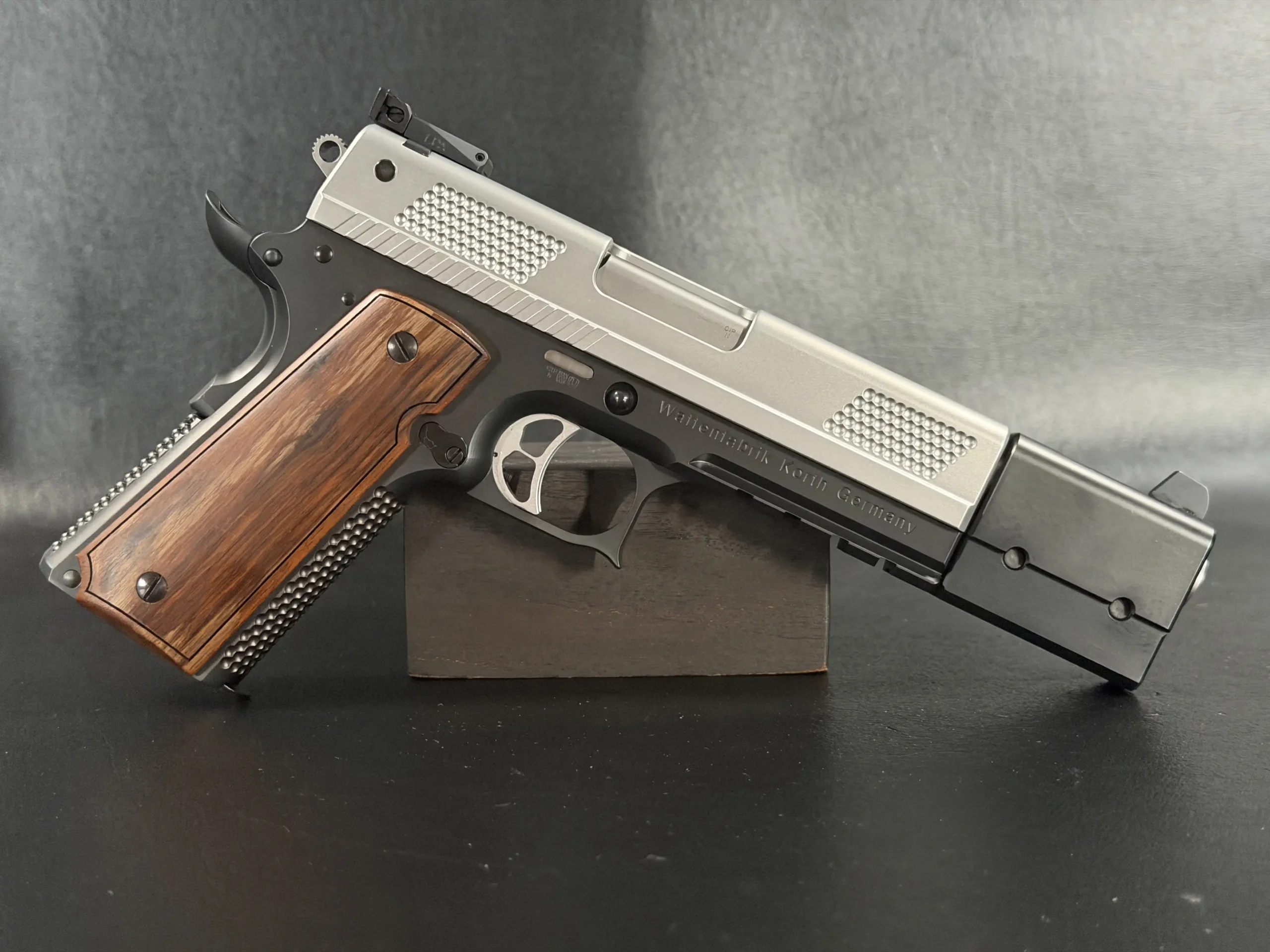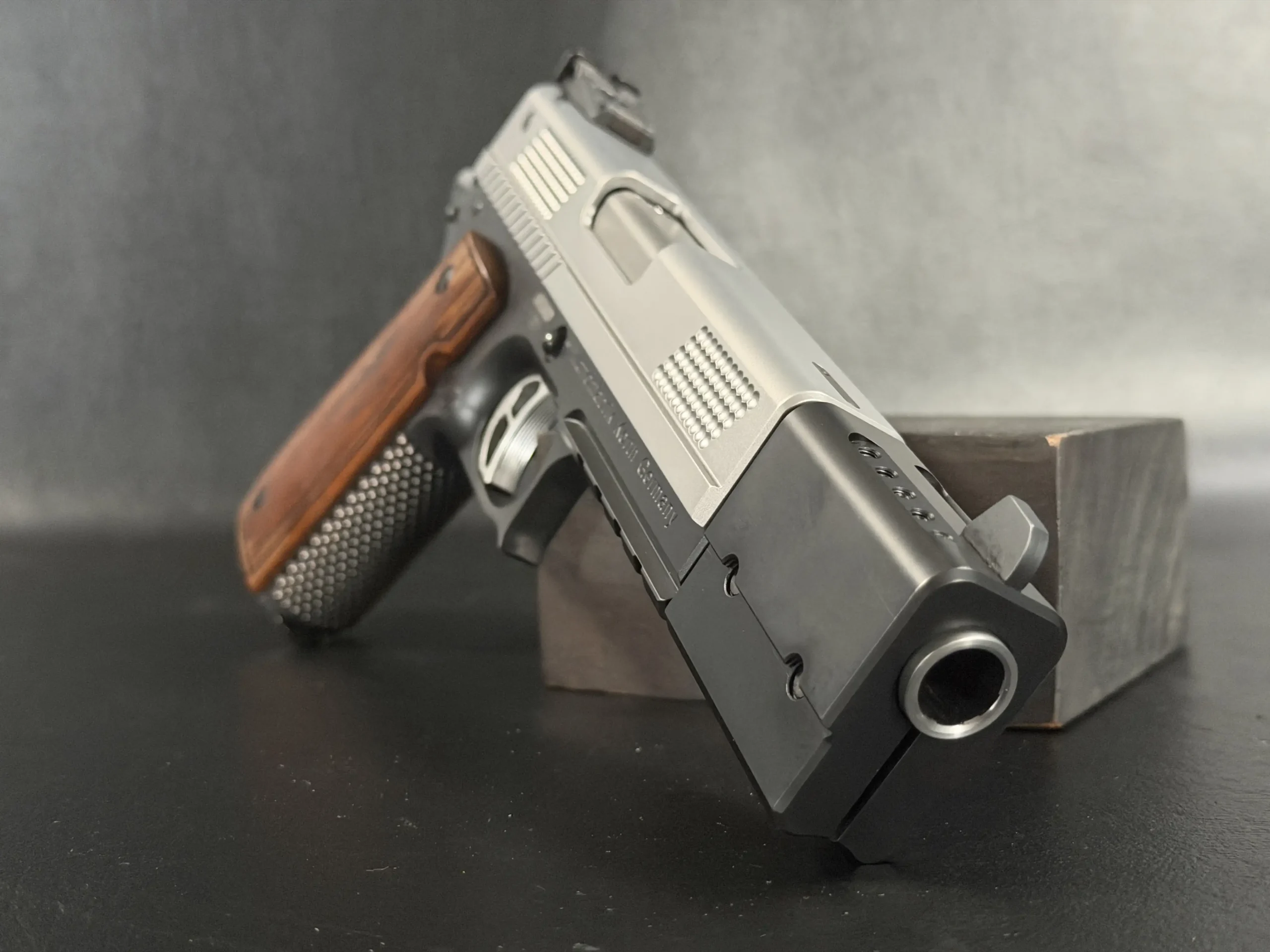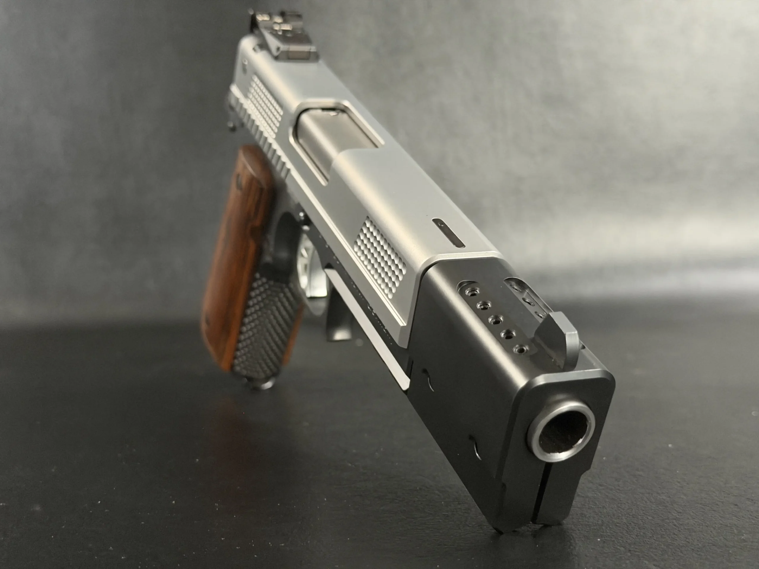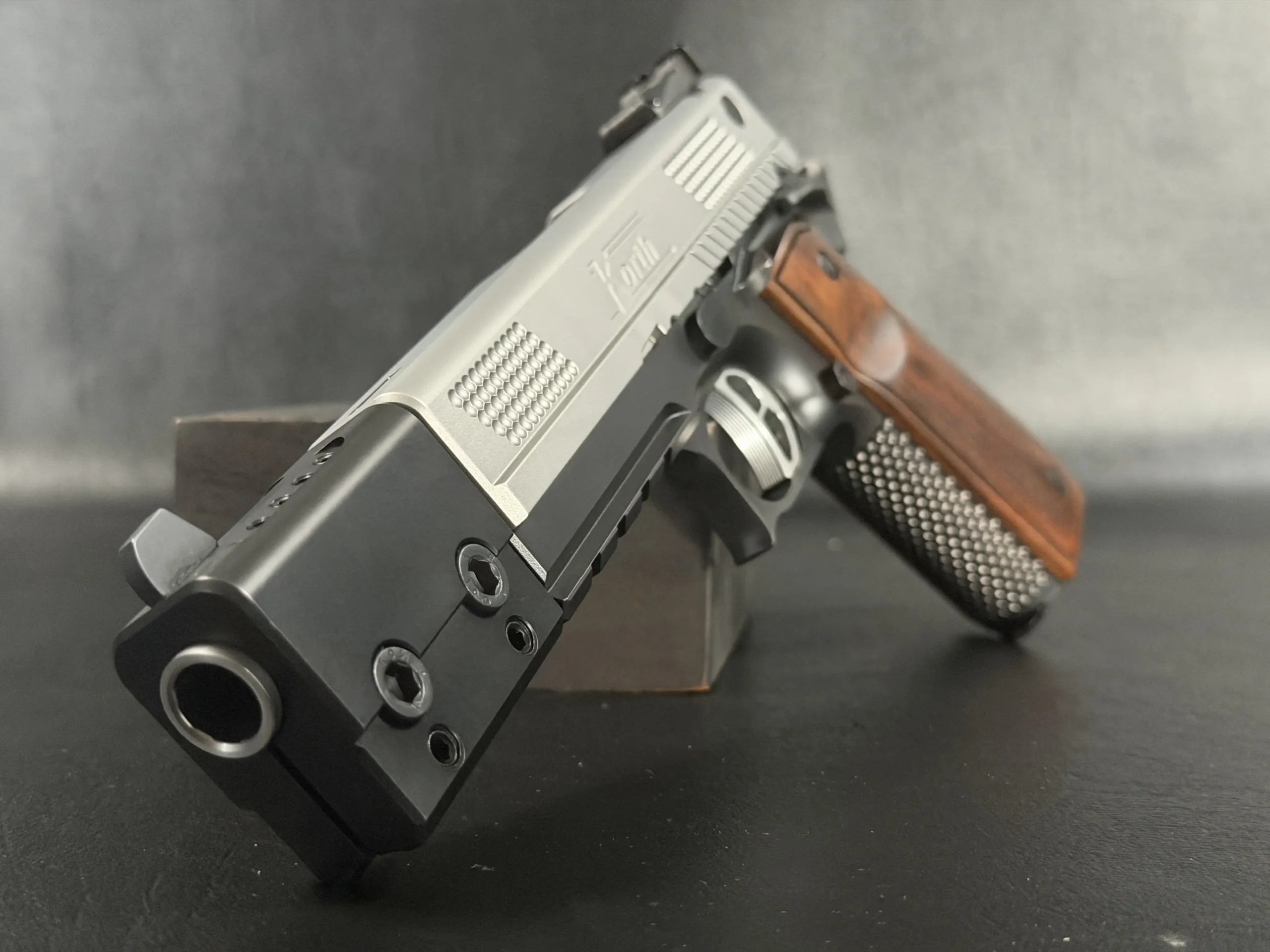The frame features a finely checkered front strap and mainspring housing, while hand-fitted walnut grip panels bring warmth and contrast to the monochrome metalwork. A skeletonized, precision-tuned trigger and extended, contoured controls complete the pistol’s focused, deliberate layout.