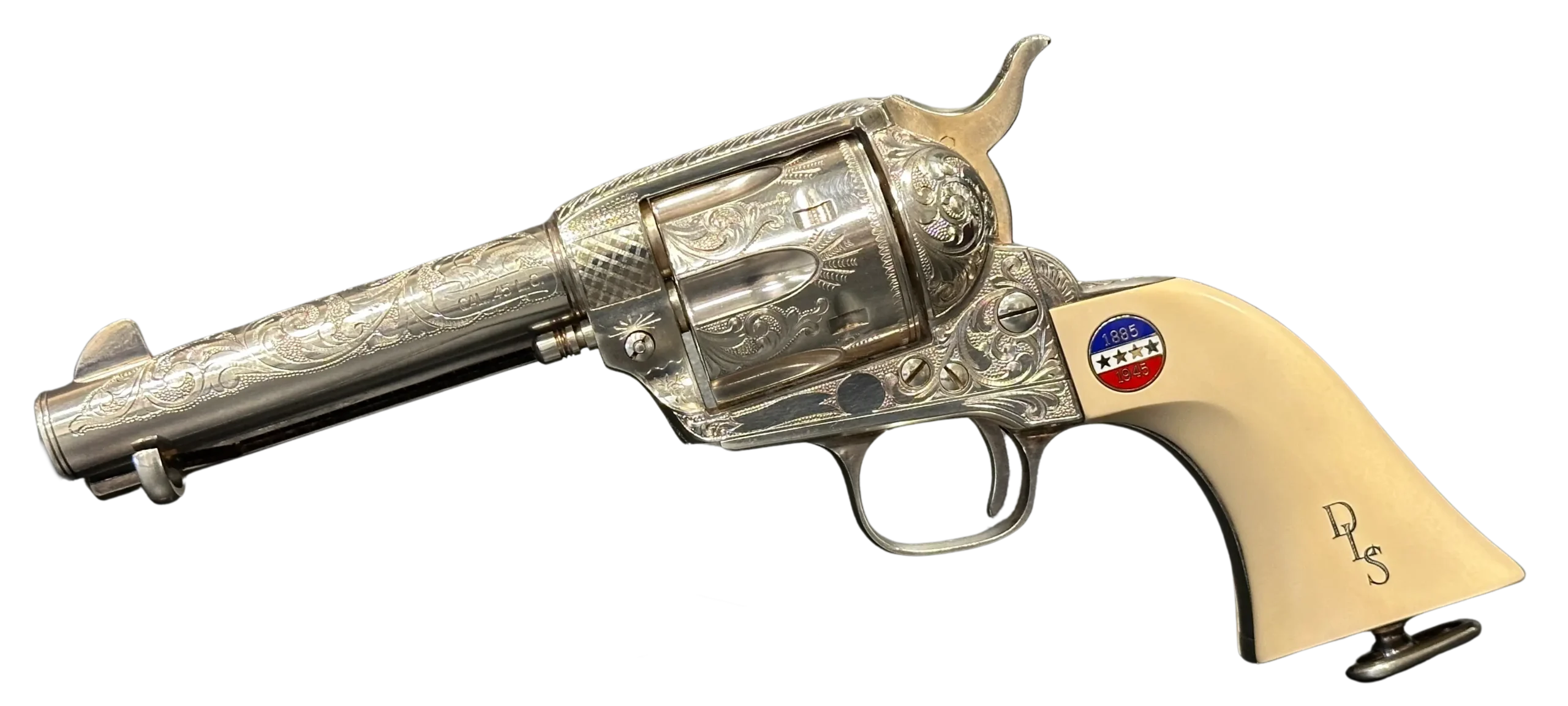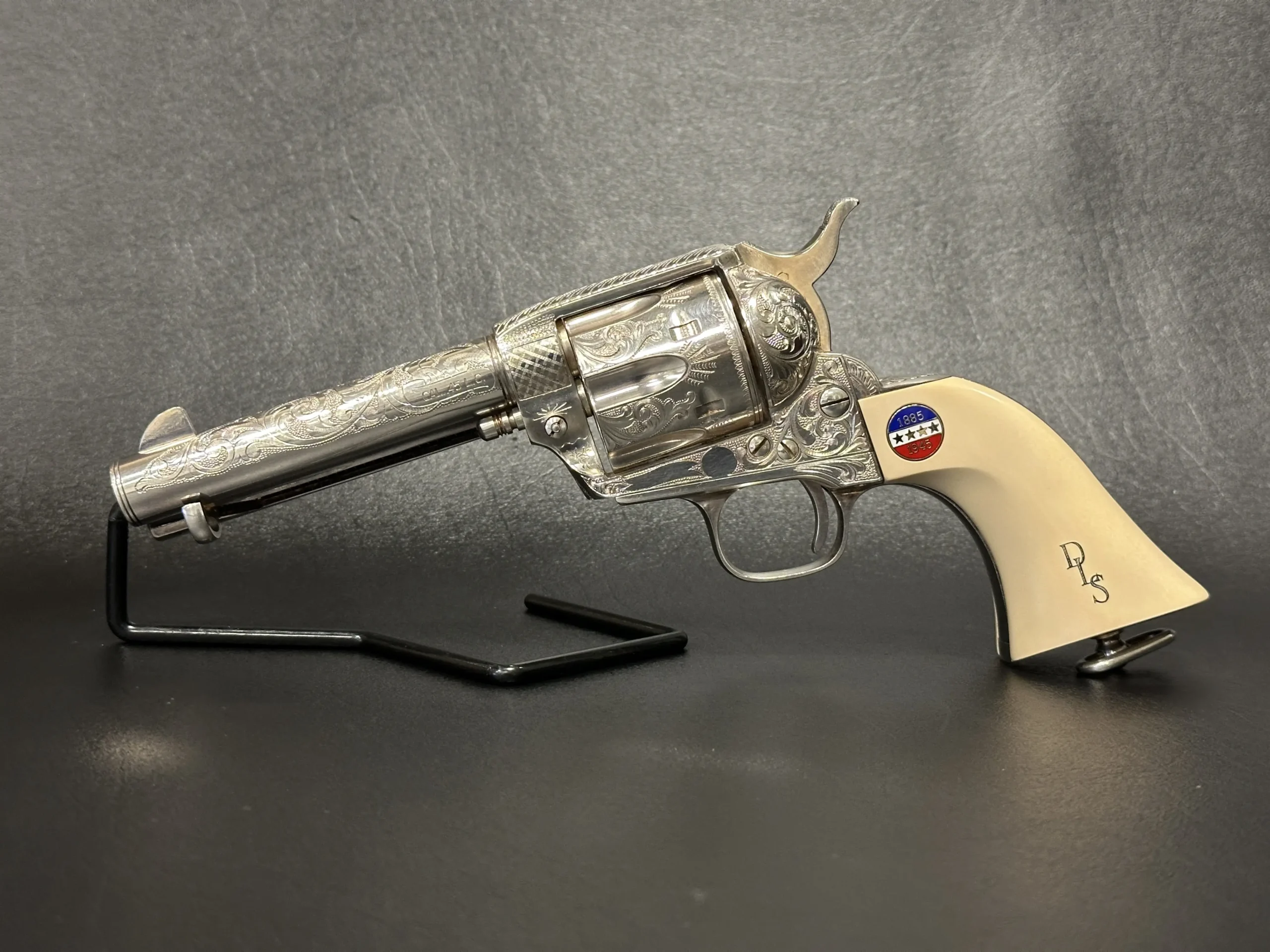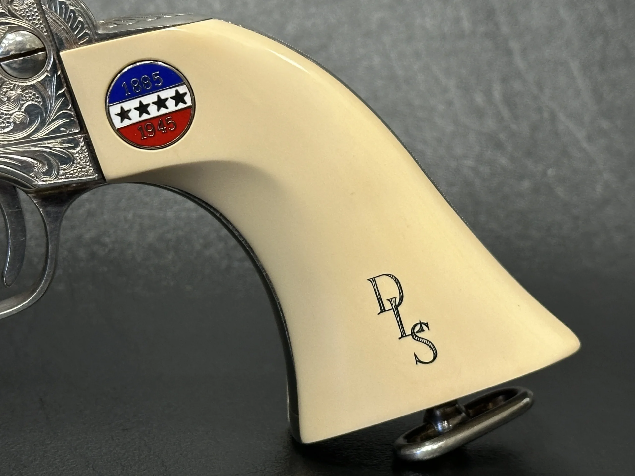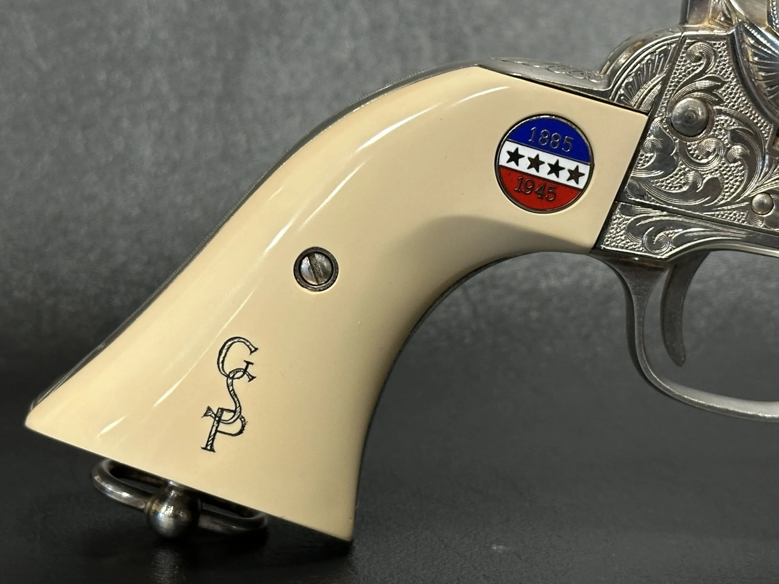 Approximately three-quarters of the surface features floral scroll engraving, set against a full silver-plated finish. The grips are fitted with medallions marked “1885/1945,” referencing Patton’s birth year and the close of his military journey. Additional “DLS” and “GSP” initials appear as part of the design.