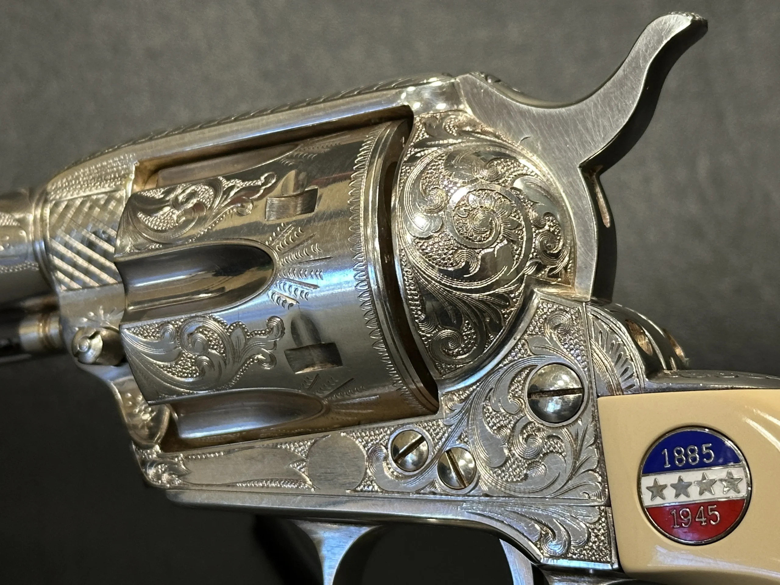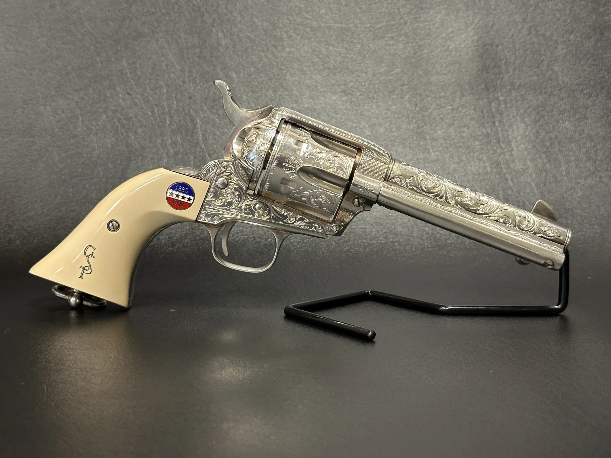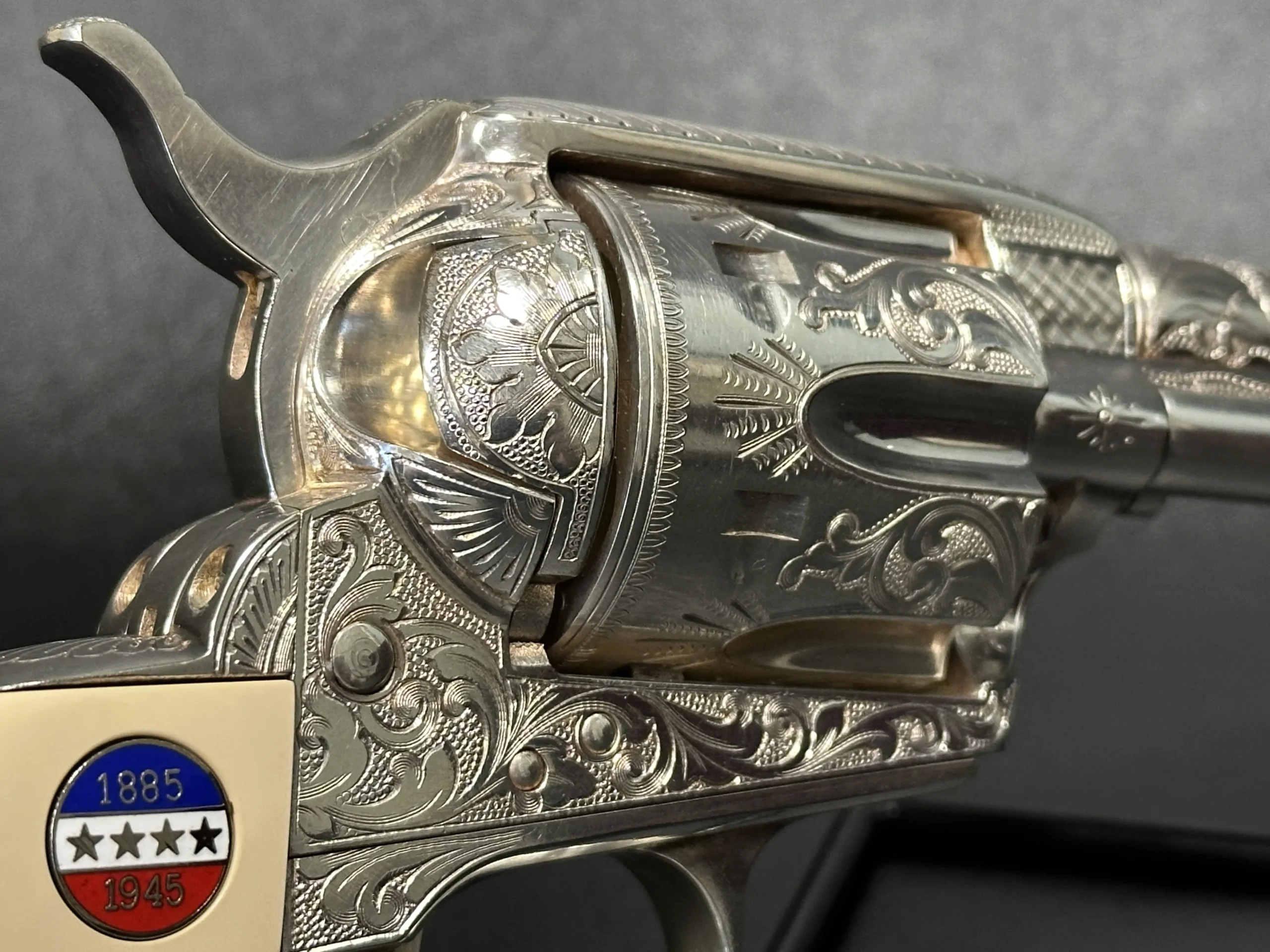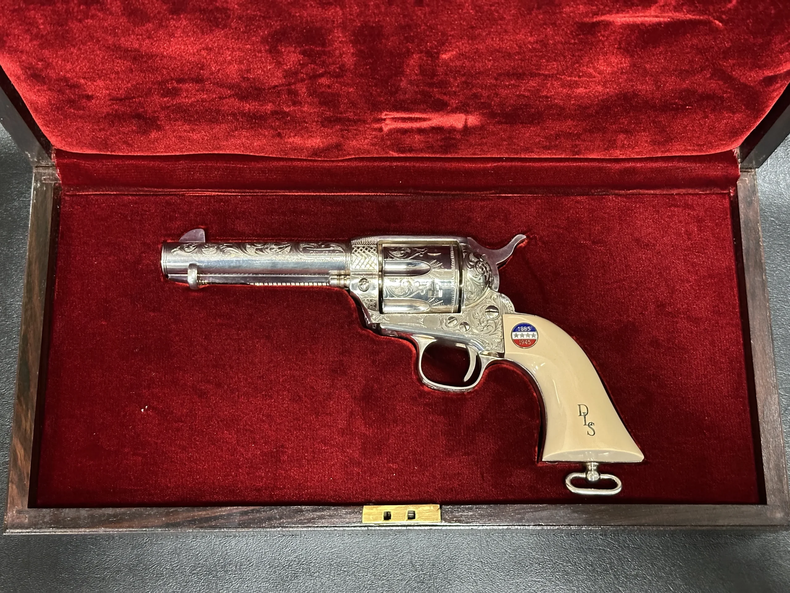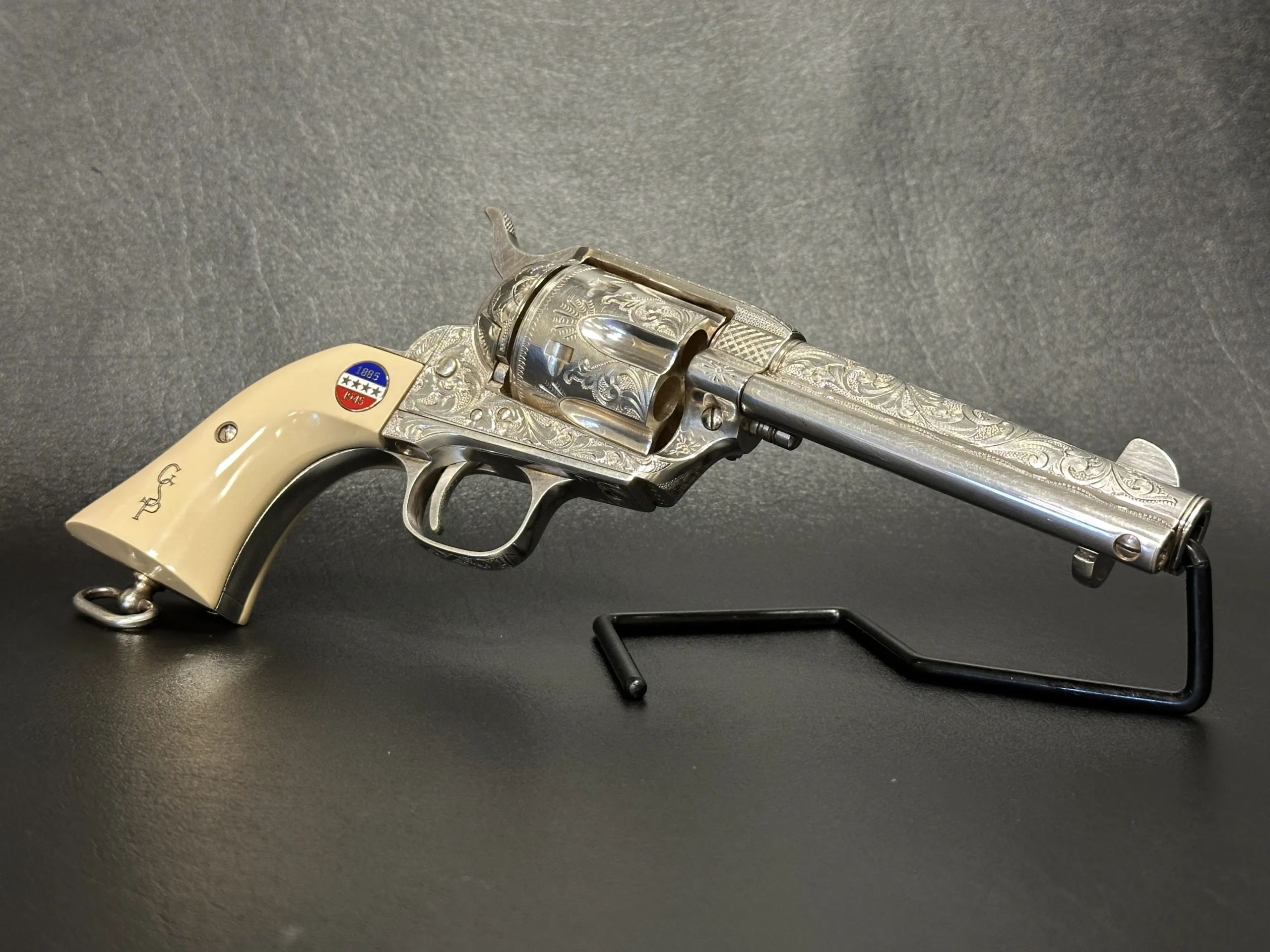 Approximately three-quarters of the surface features floral scroll engraving, set against a full silver-plated finish. The grips are fitted with medallions marked “1885/1945,” referencing Patton’s birth year and the close of his military journey. Additional “DLS” and “GSP” initials appear as part of the design.