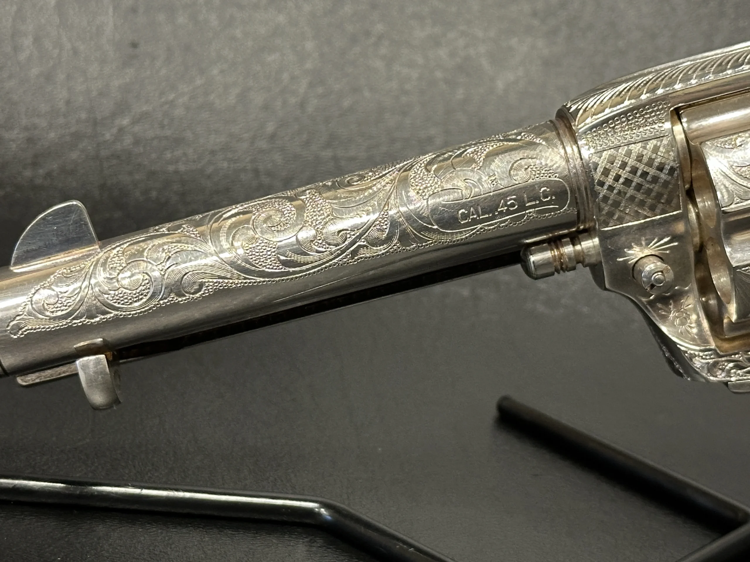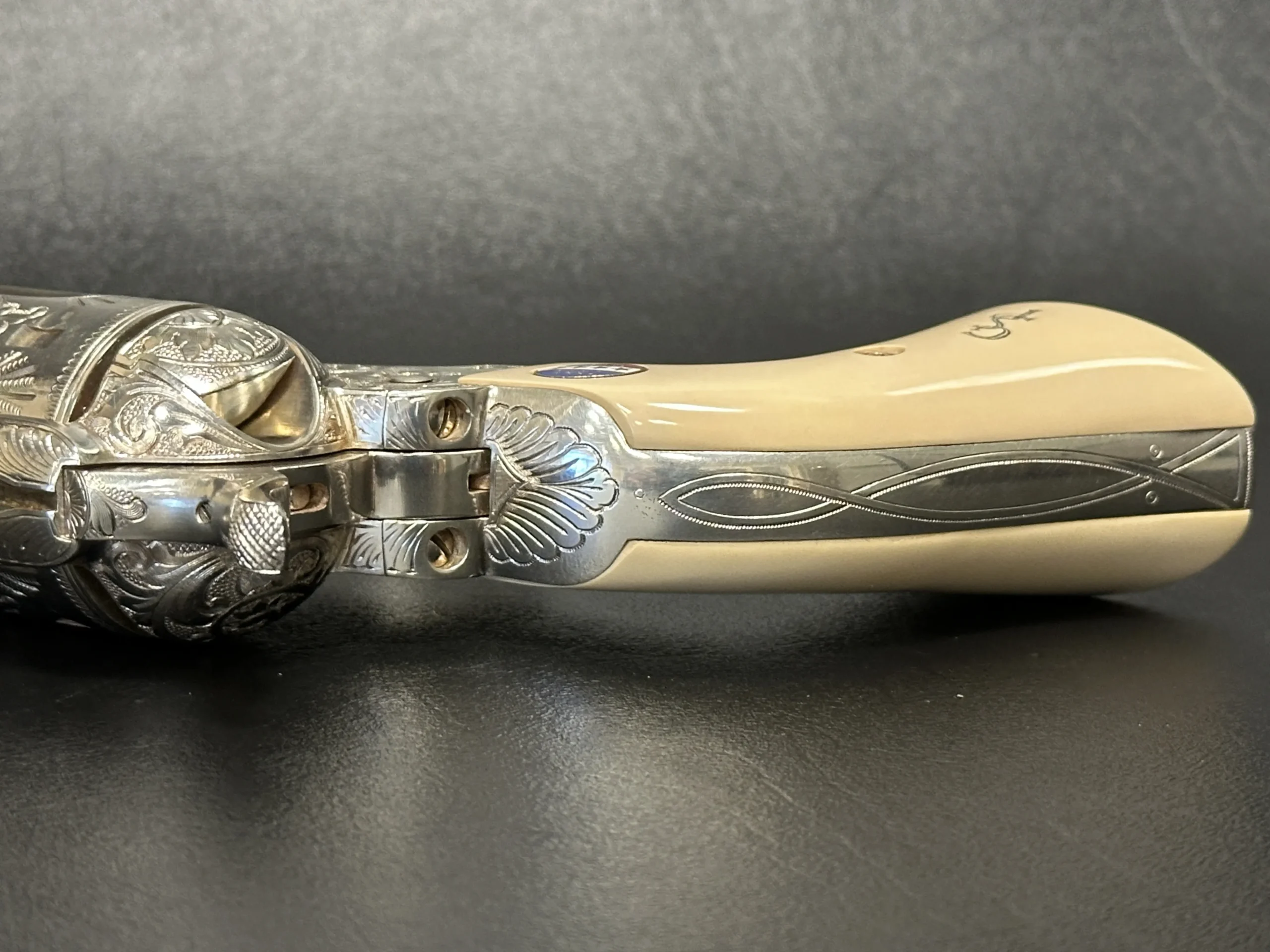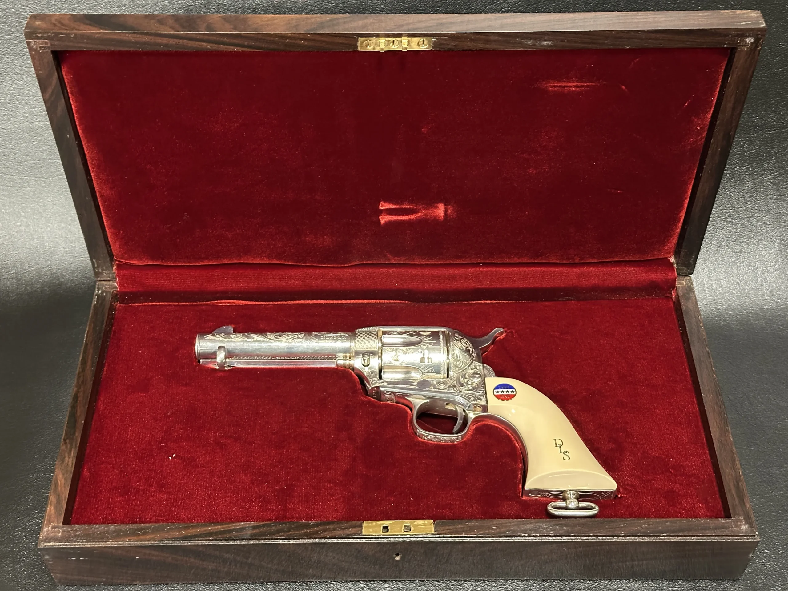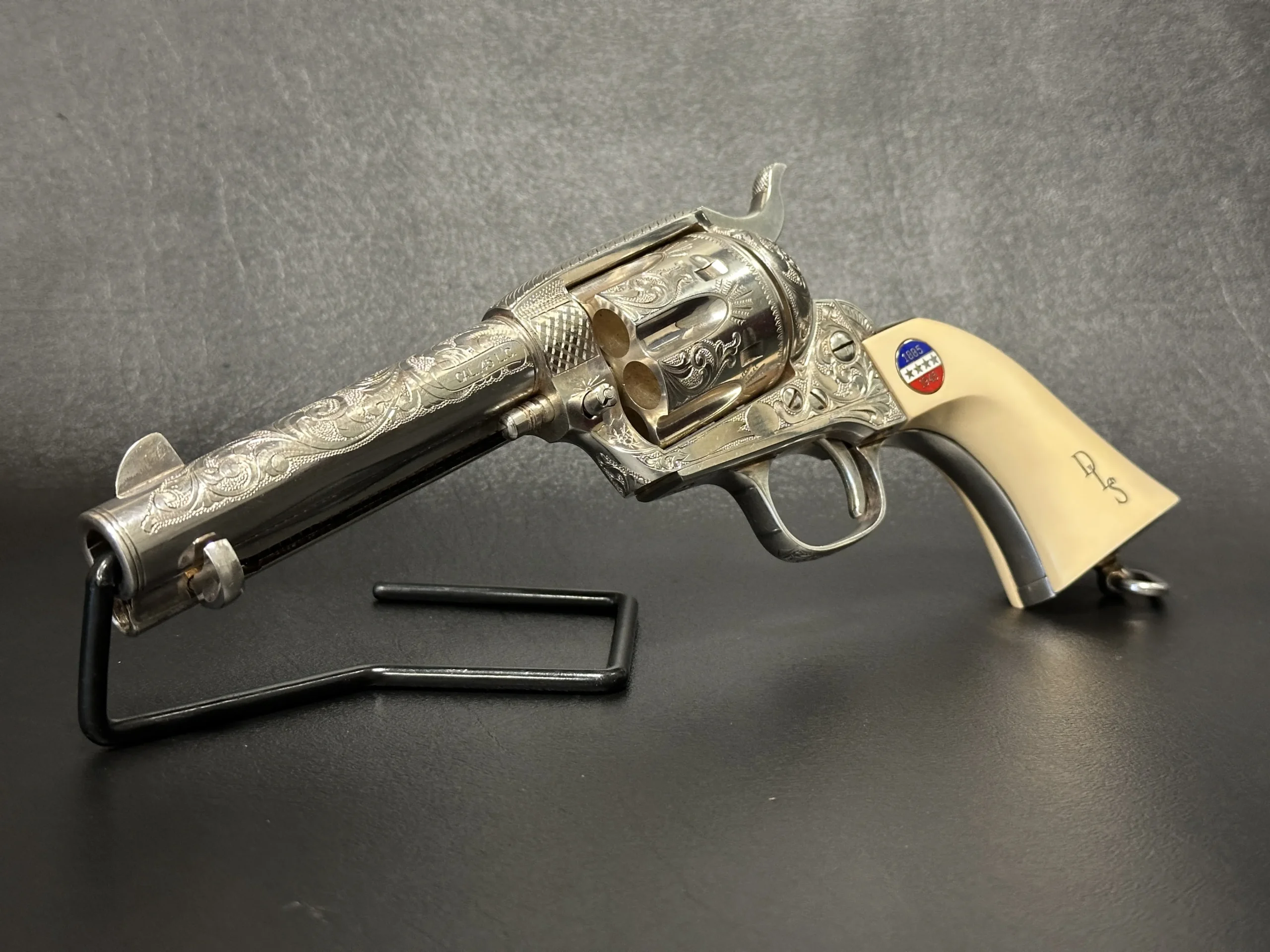 Approximately three-quarters of the surface features floral scroll engraving, set against a full silver-plated finish. The grips are fitted with medallions marked “1885/1945,” referencing Patton’s birth year and the close of his military journey. Additional “DLS” and “GSP” initials appear as part of the design.