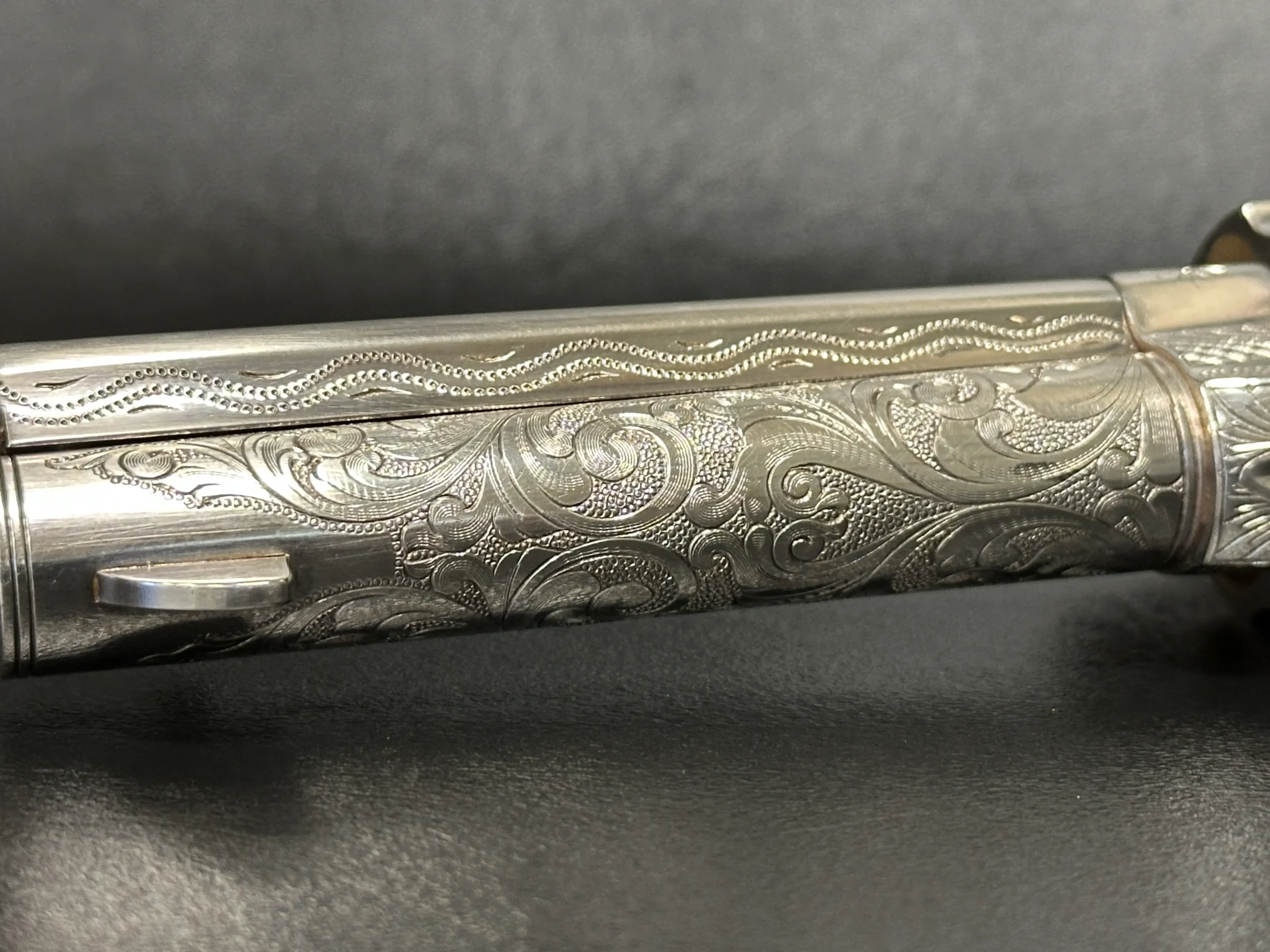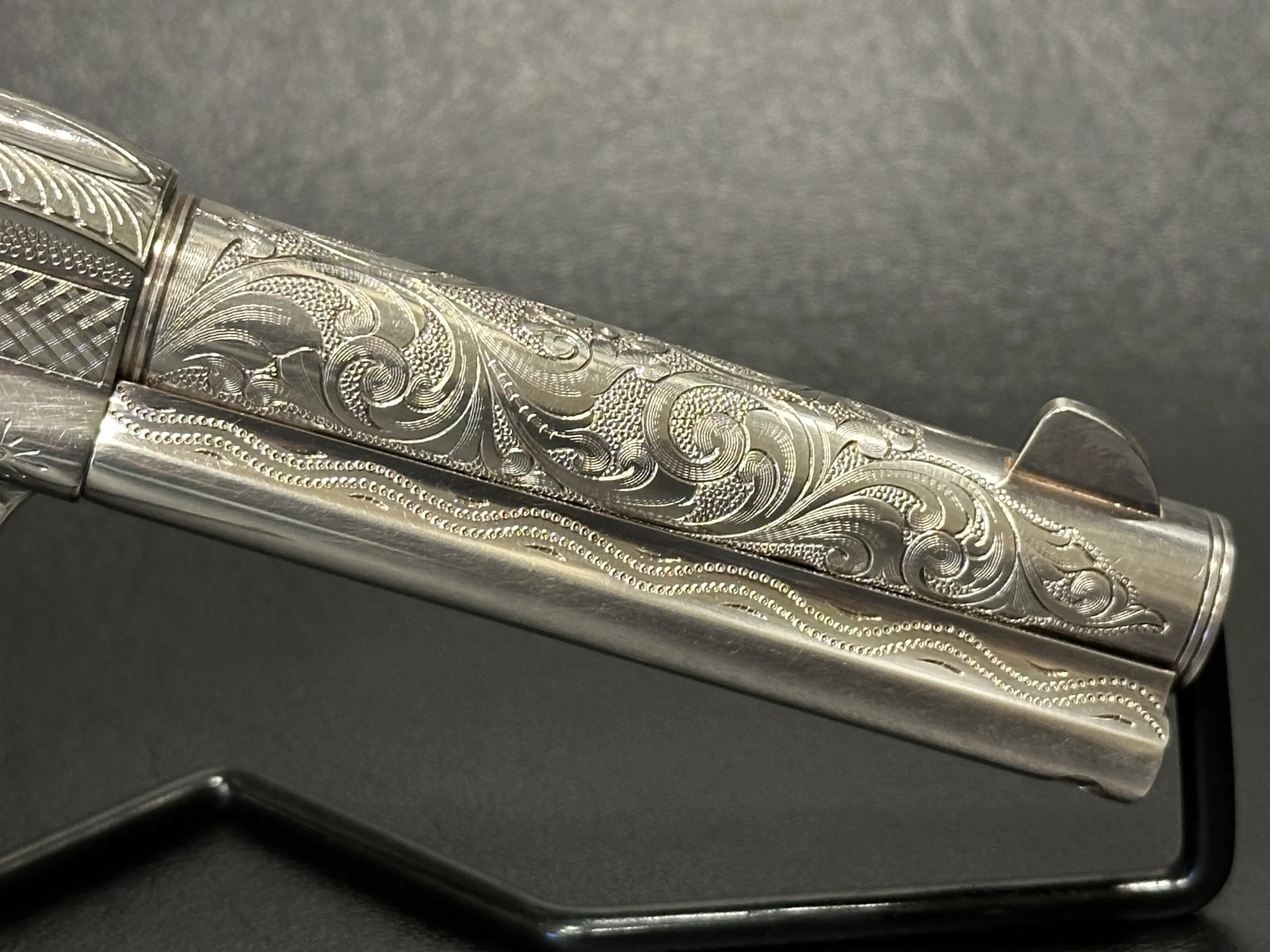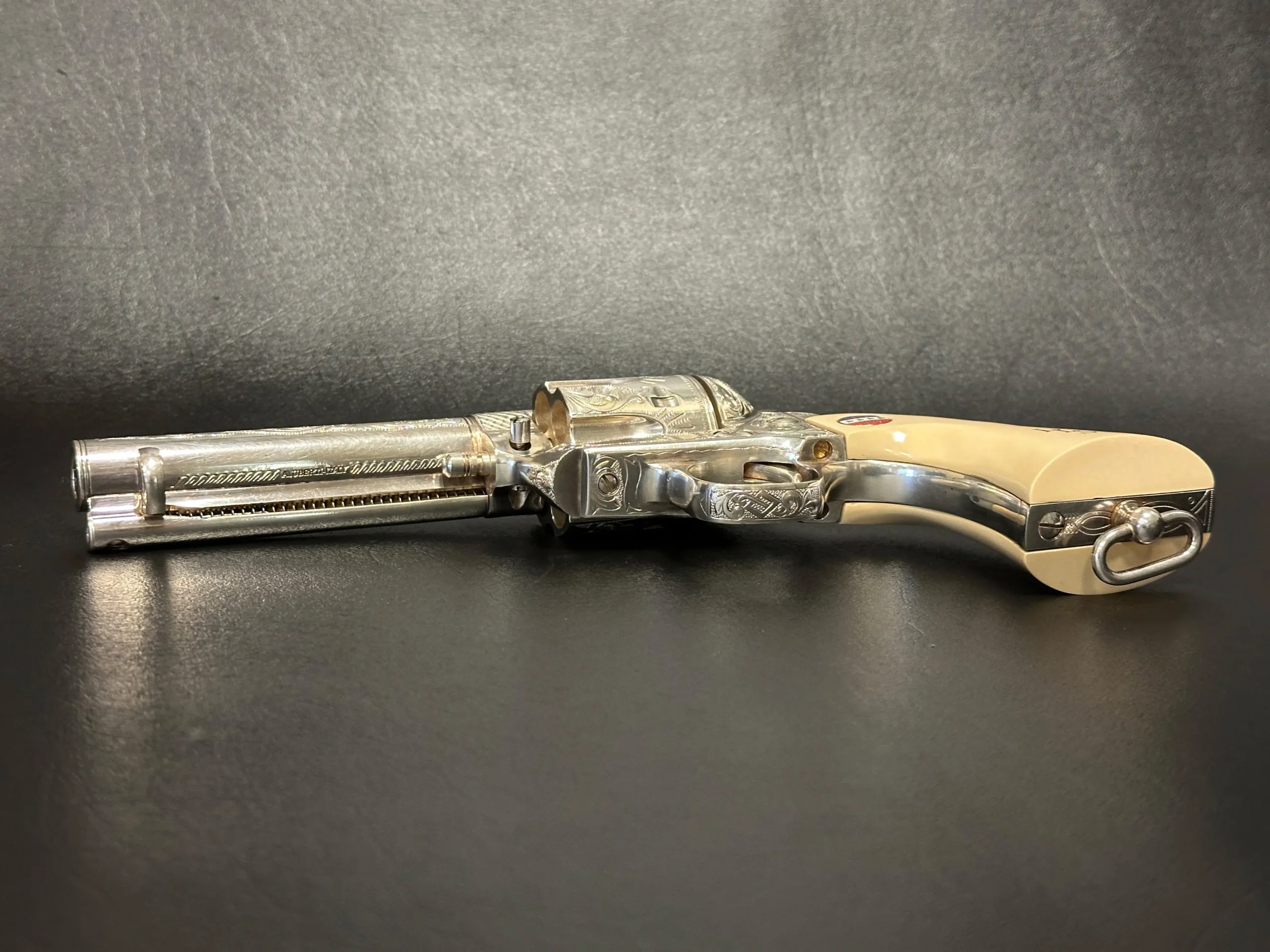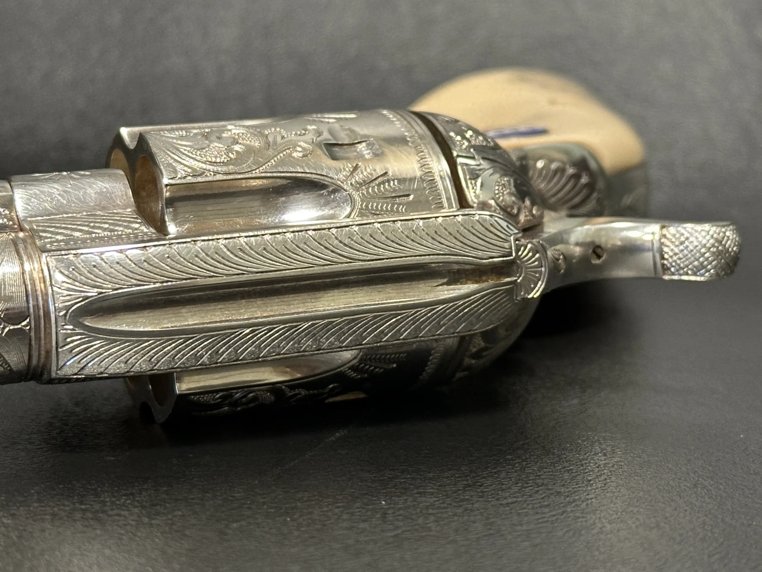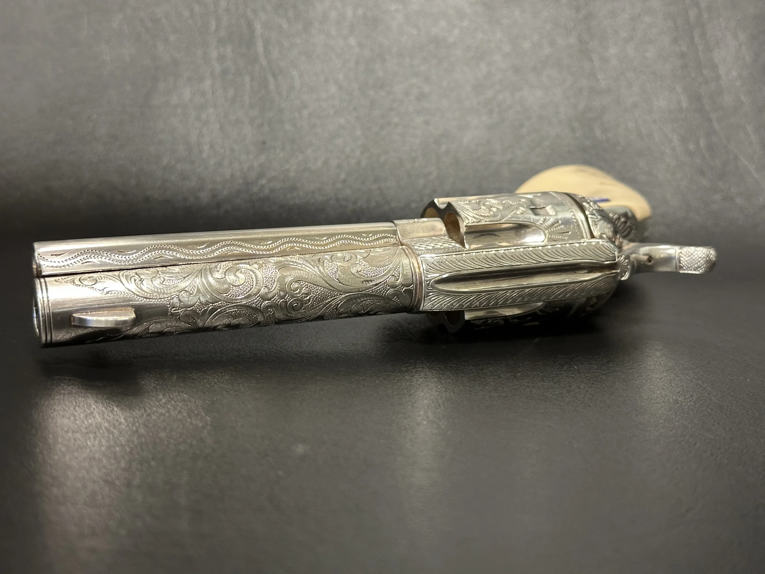 A lanyard loop on the butt adds another period-inspired detail, reinforcing the historical character of the piece. With its engraved surfaces, silver-plated presentation, and Patton-themed accents, this revolver offers a distinctive commemorative interpretation of the Single Action Army.