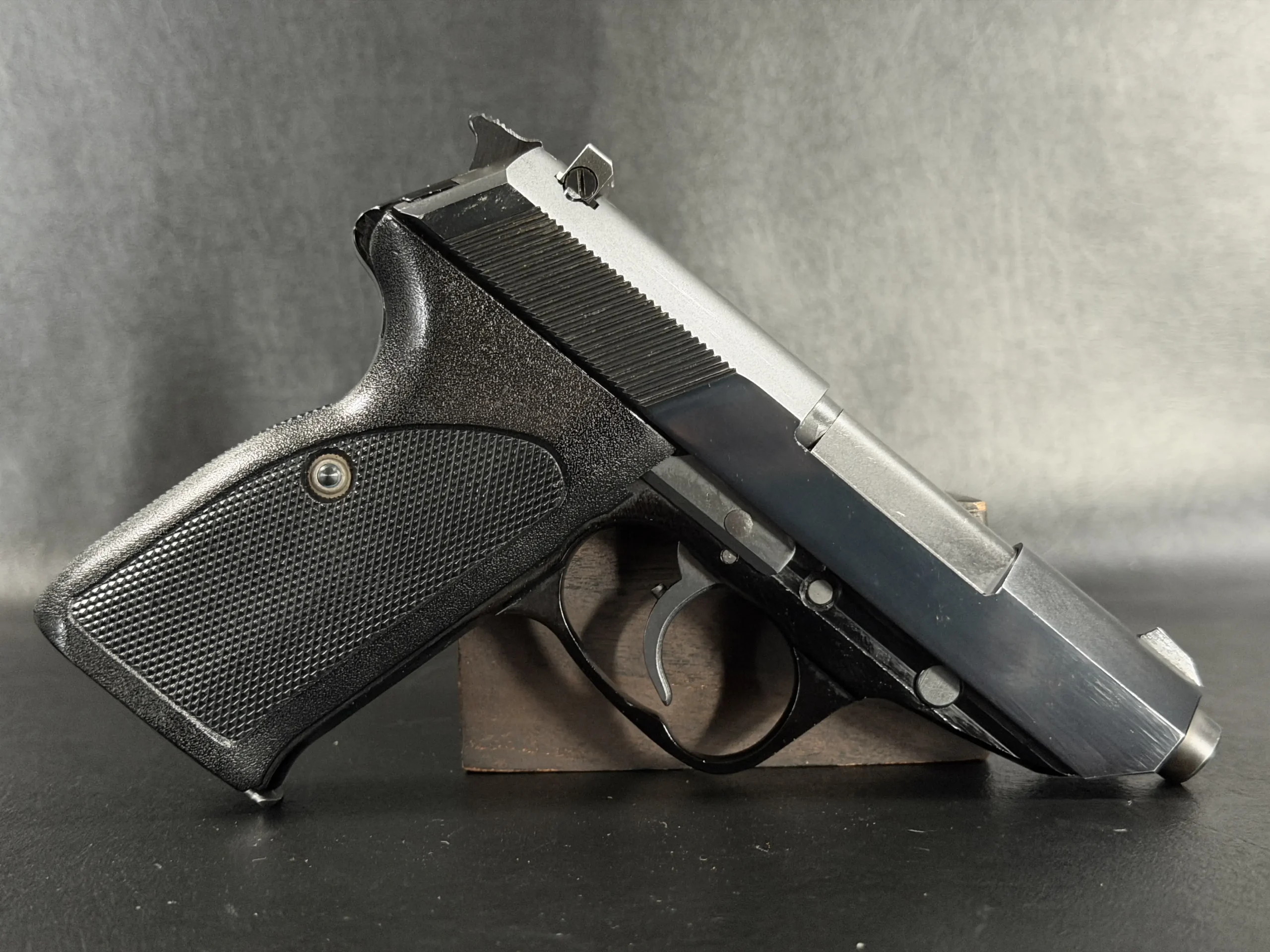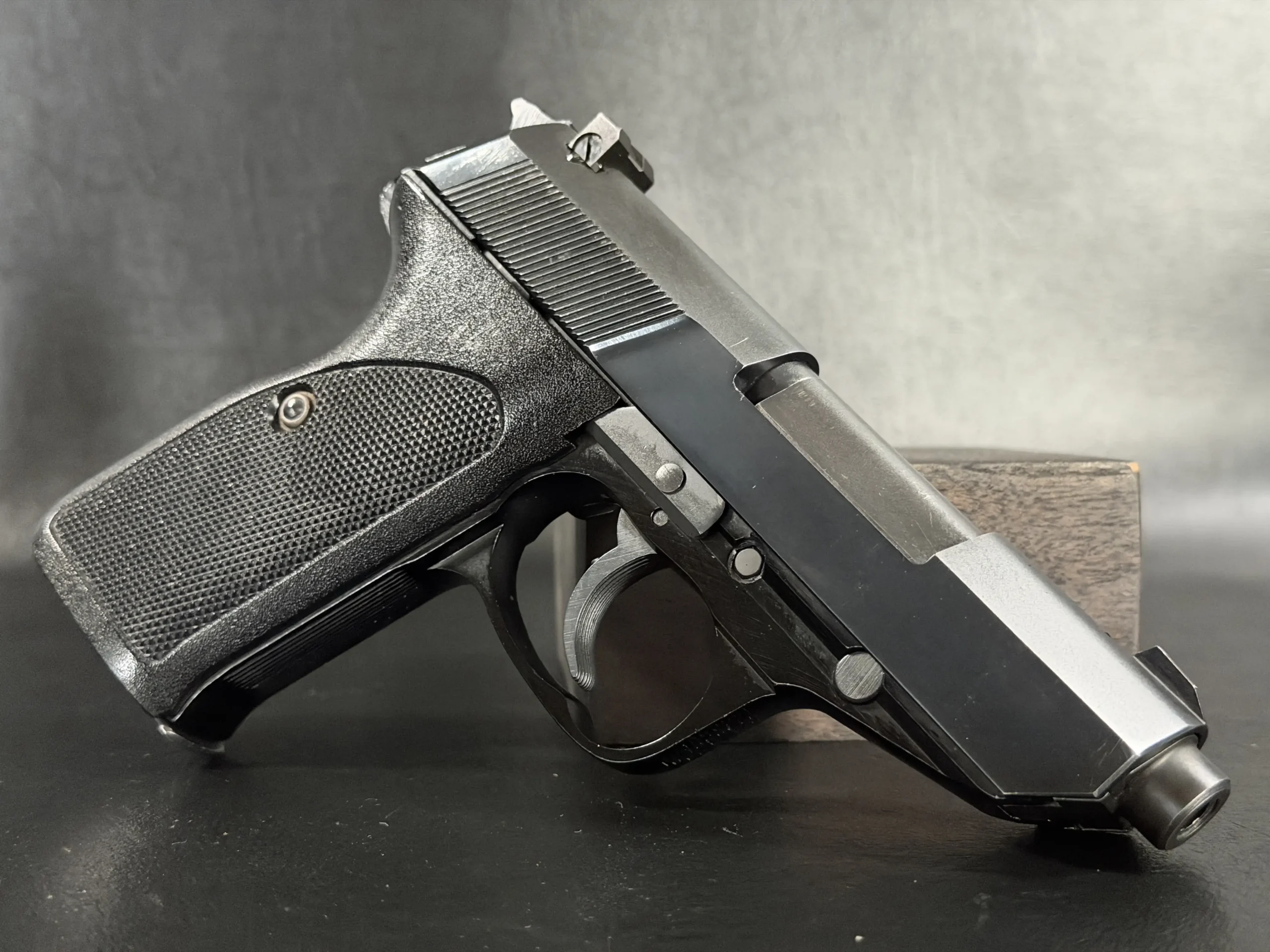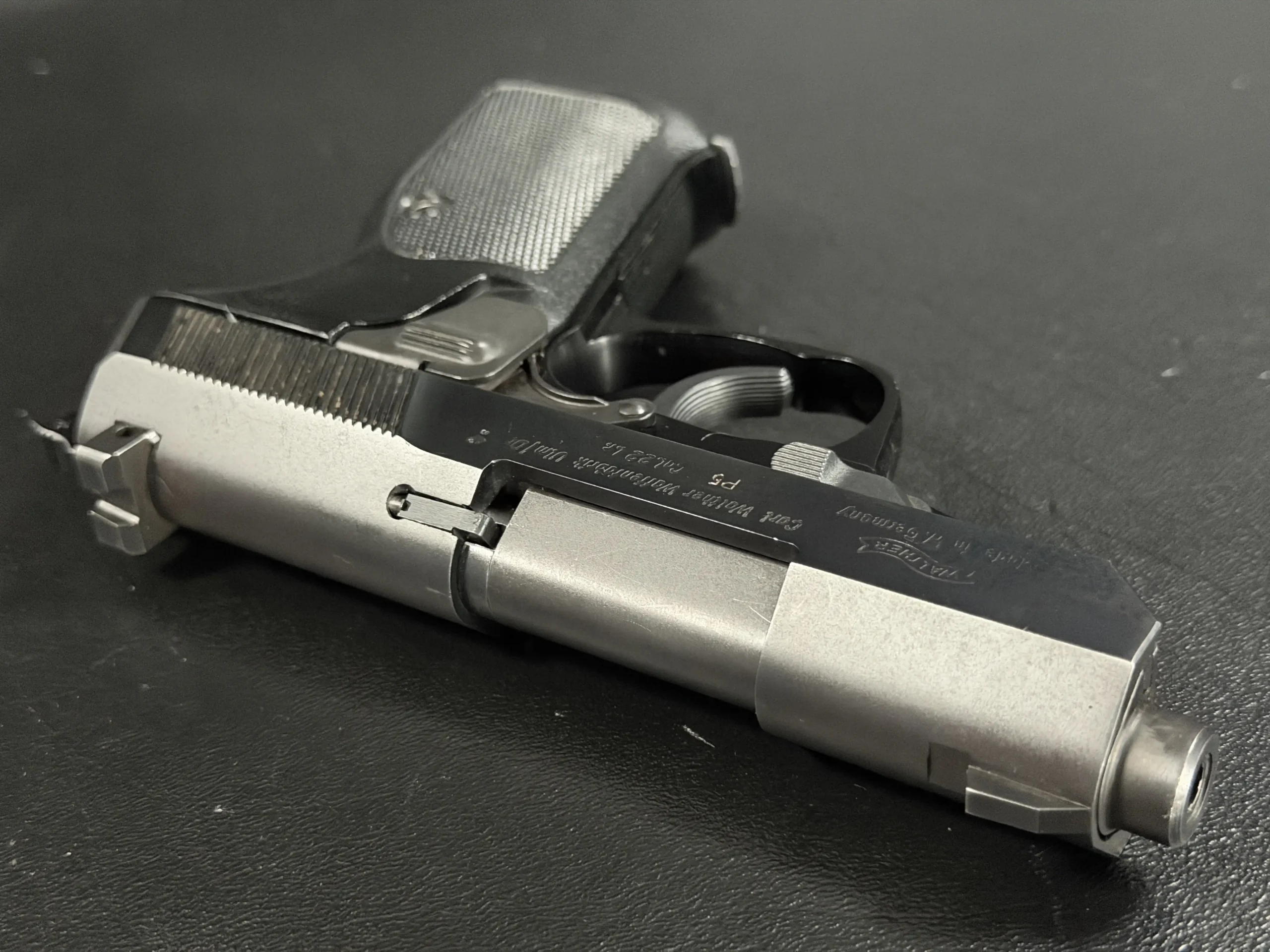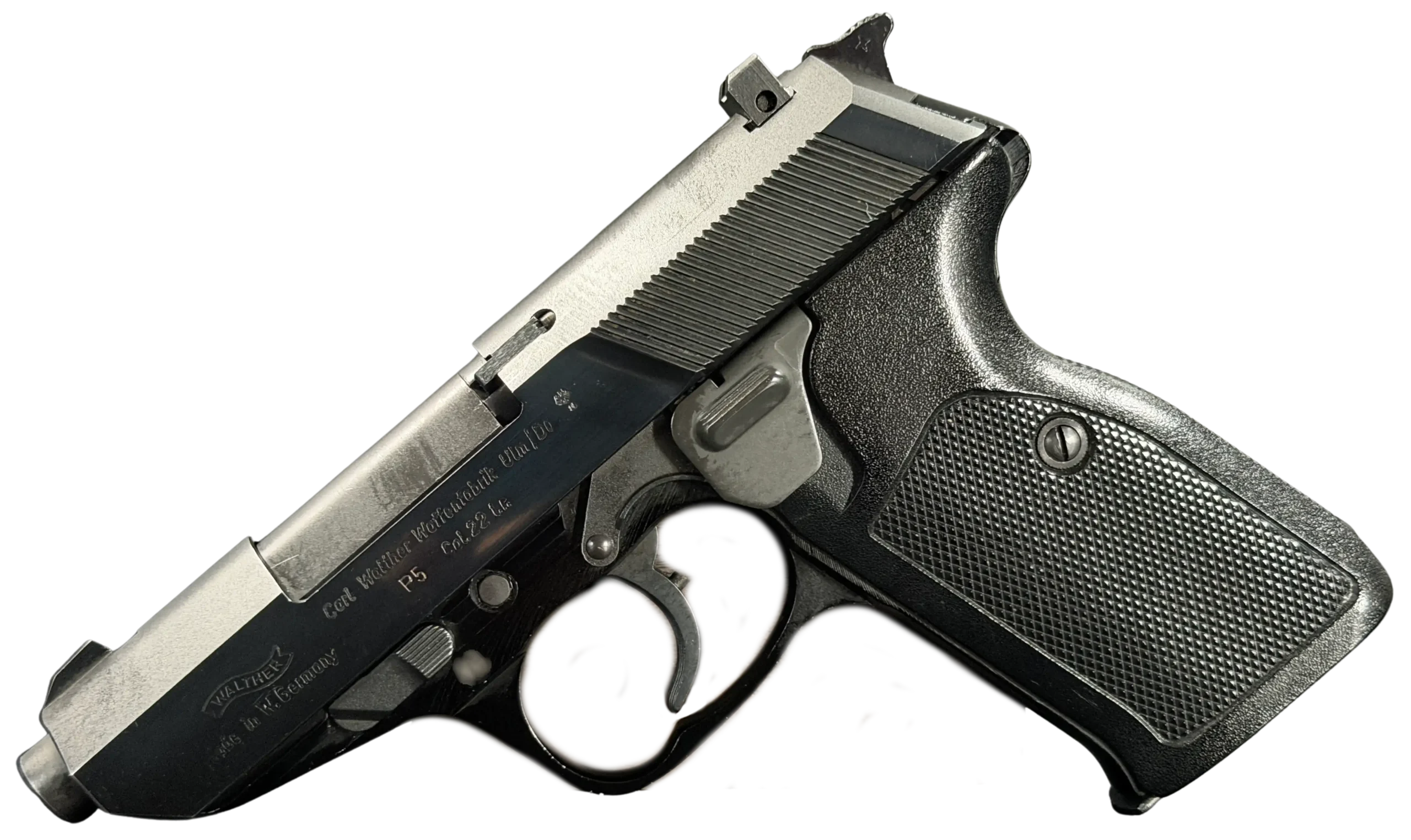 This example is described in a classic factory configuration, with matte slide flats, polished transitional surfaces, a steel slide, and an alloy frame with a deep, uniform finish. Details such as the serrated slide treatment, frame-mounted decocking system, sculpted trigger guard, and black checkered grip panels reflect the visual language collectors associate with the Walther P5.