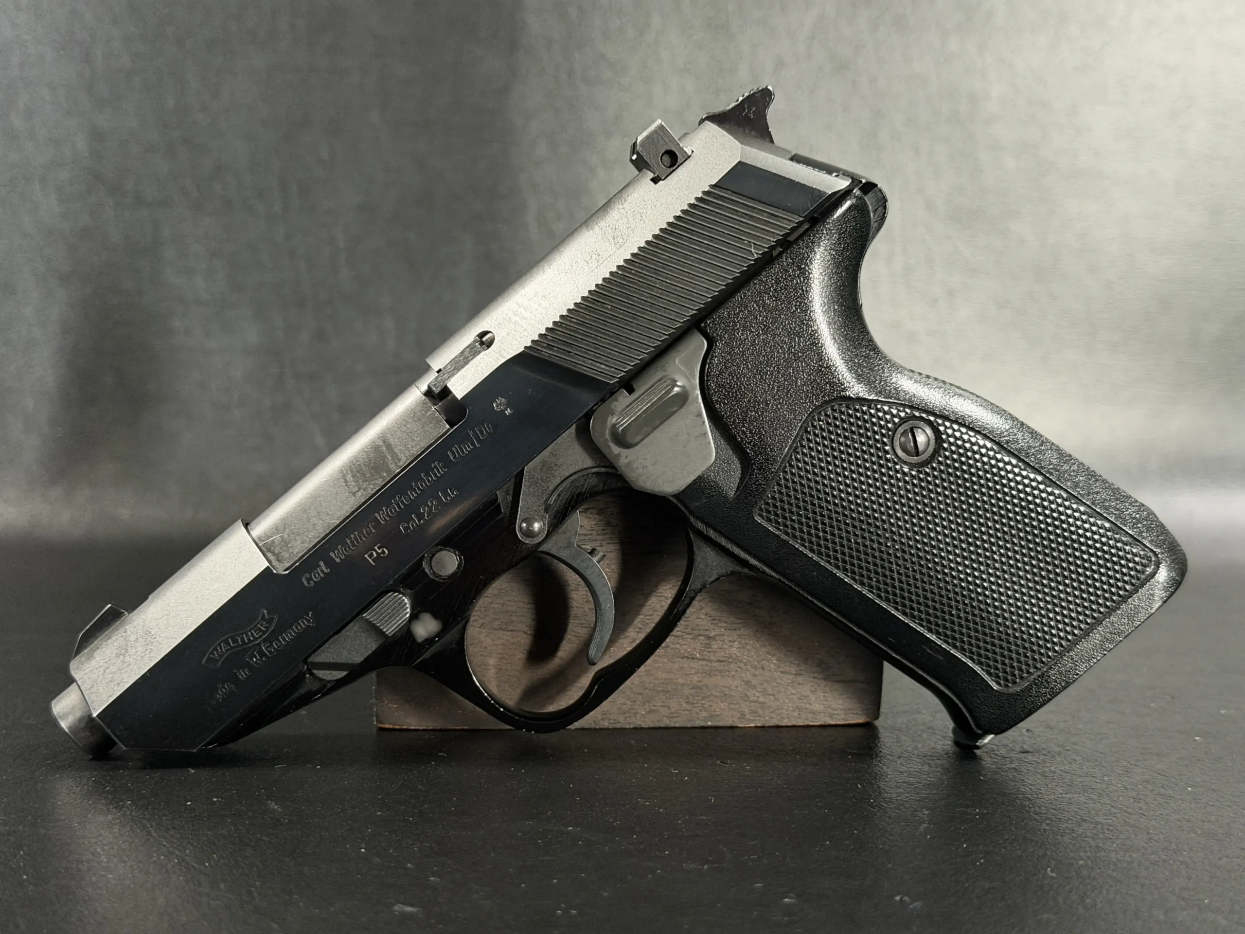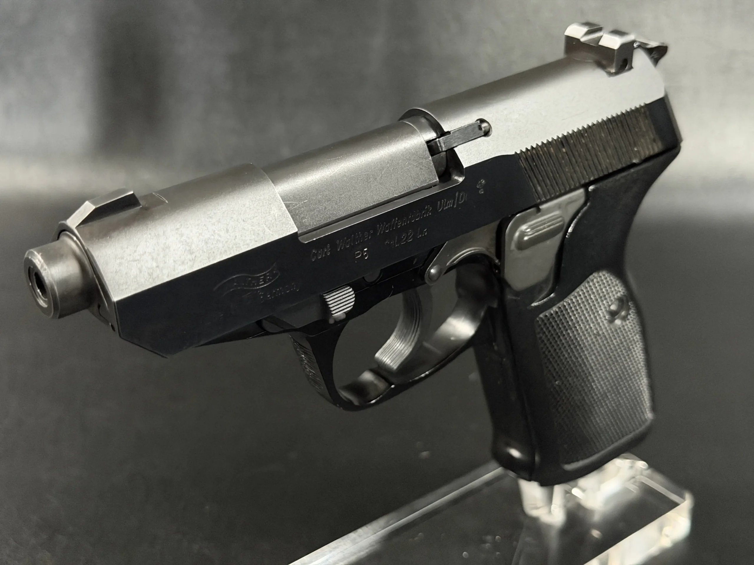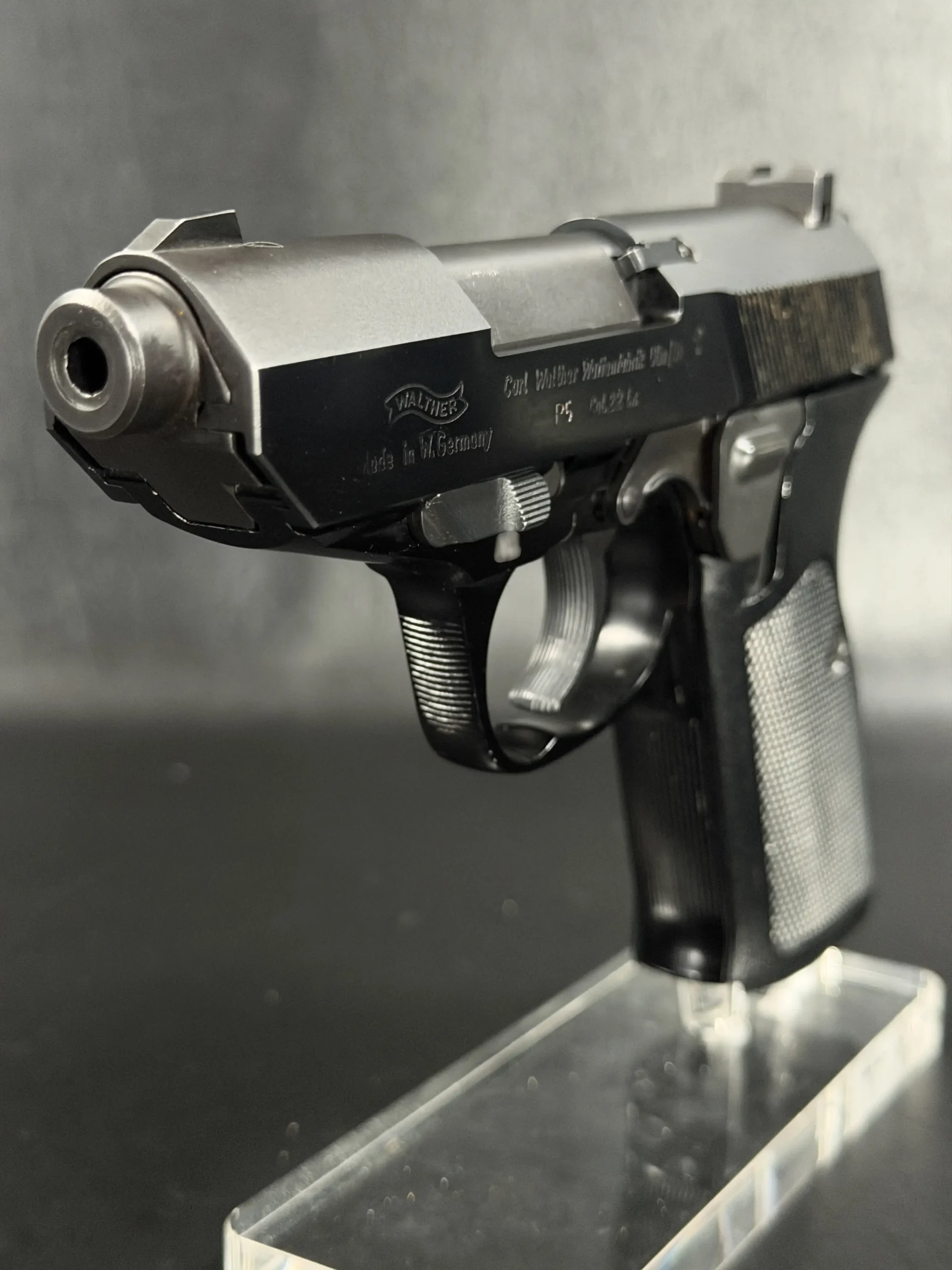 With its angular slide profile, exposed barrel geometry, and balanced proportions, the Walther P5 .22 LR retains the technical, purposeful character of the original design while standing apart as an unusual variation of the model.