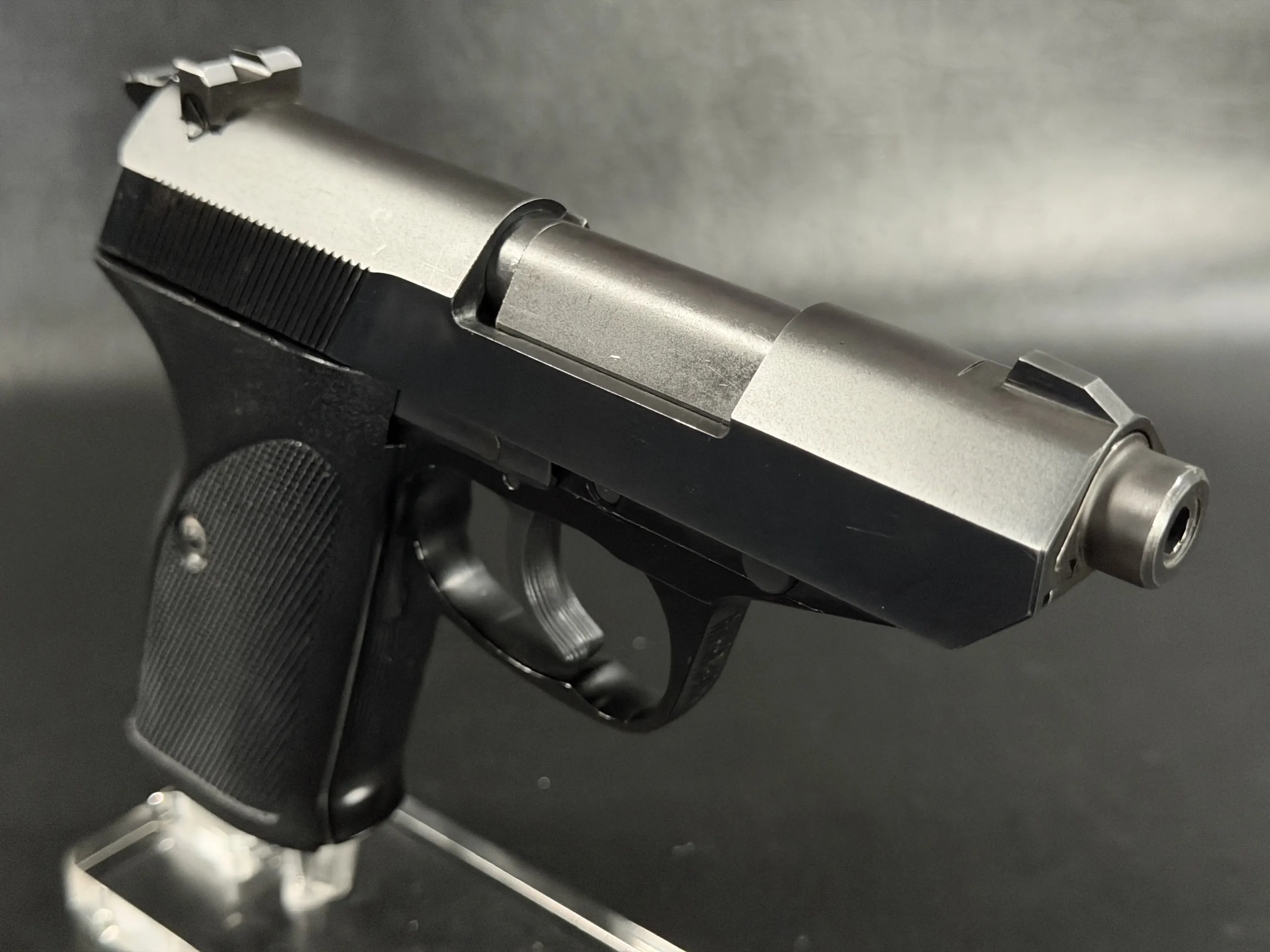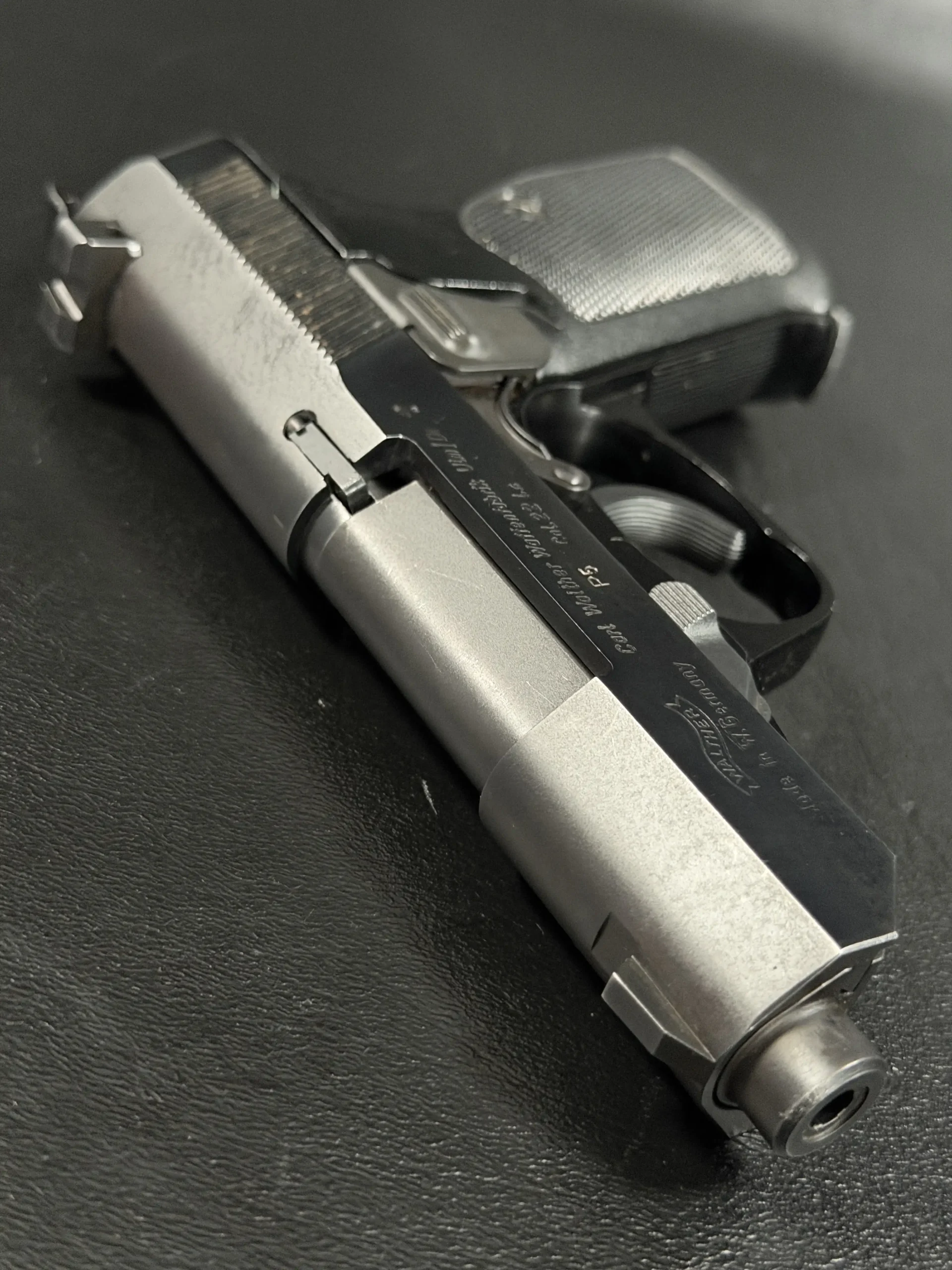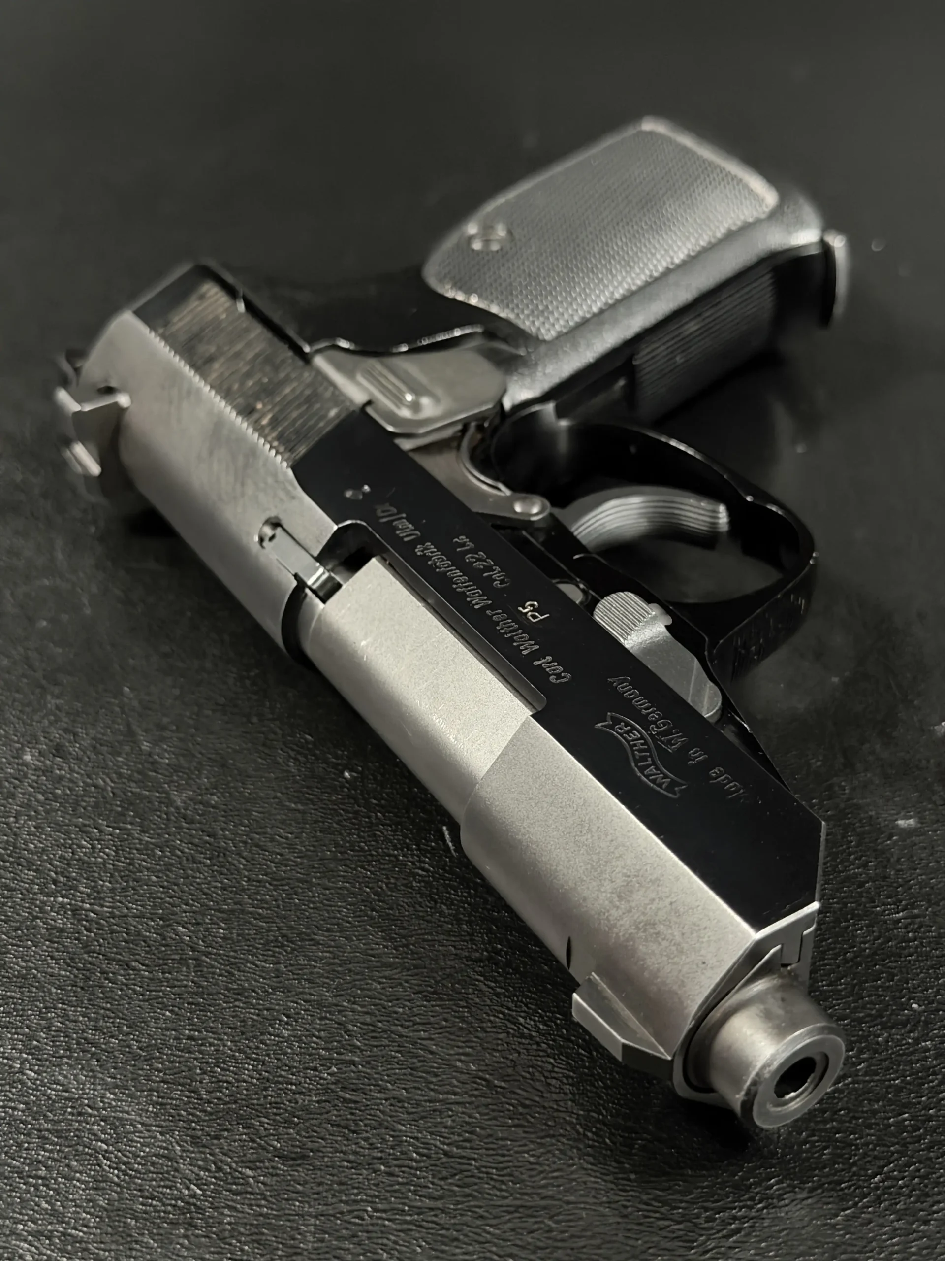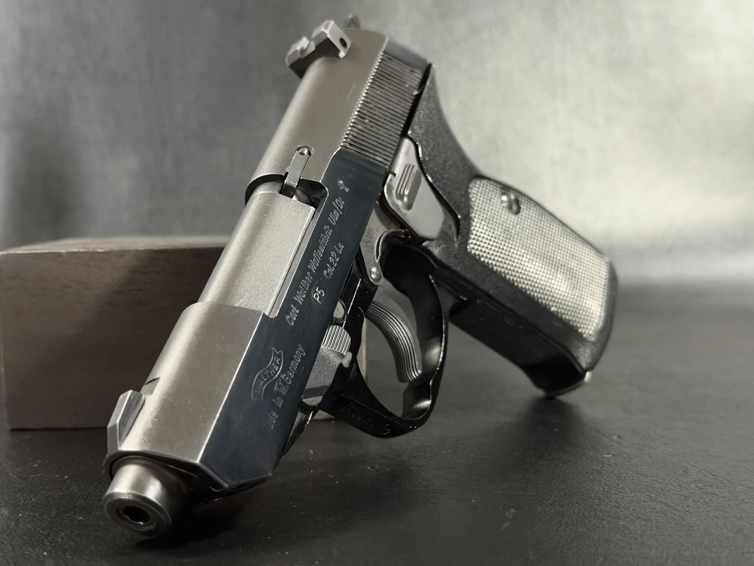 With its angular slide profile, exposed barrel geometry, and balanced proportions, the Walther P5 .22 LR retains the technical, purposeful character of the original design while standing apart as an unusual variation of the model.