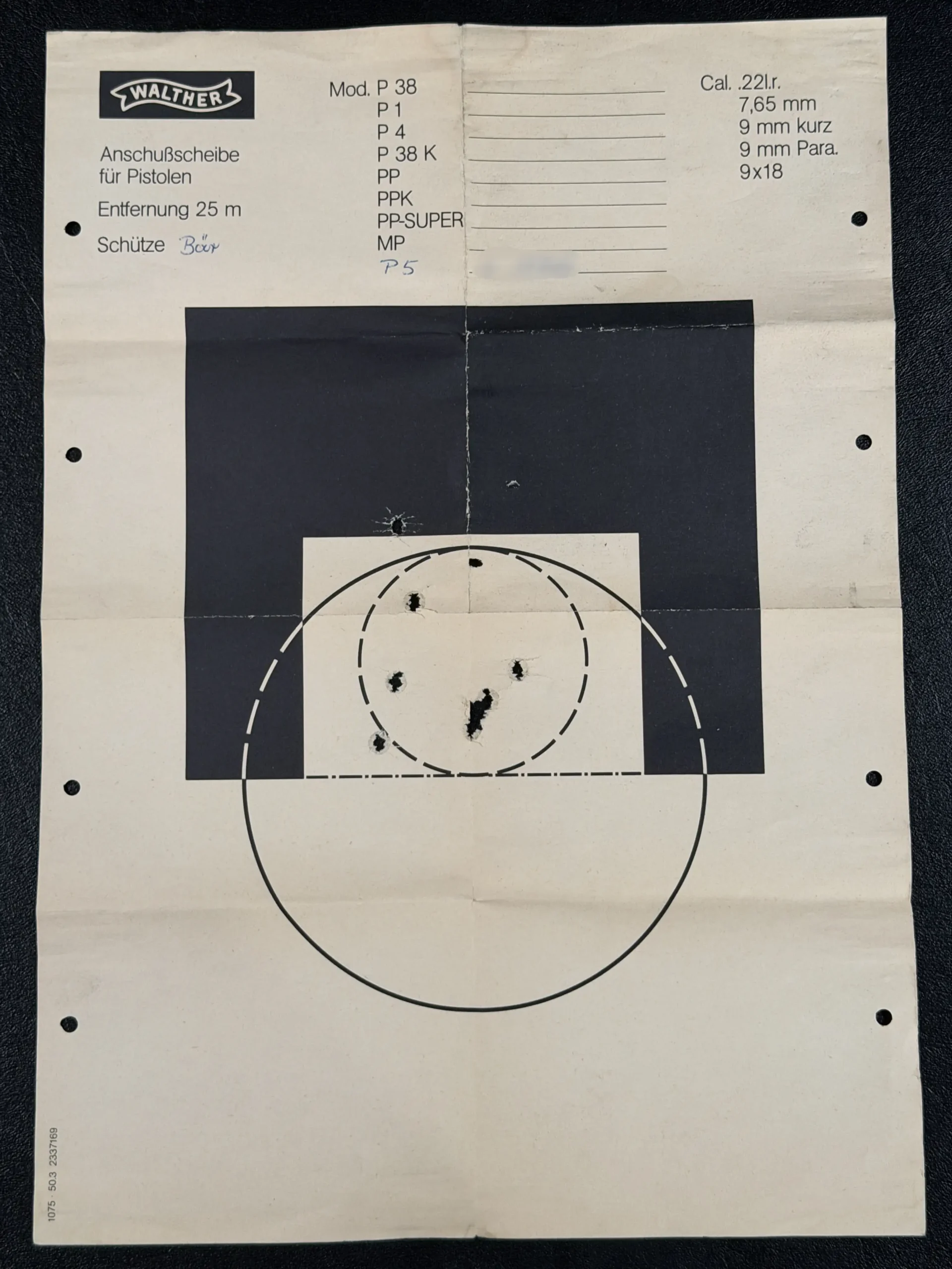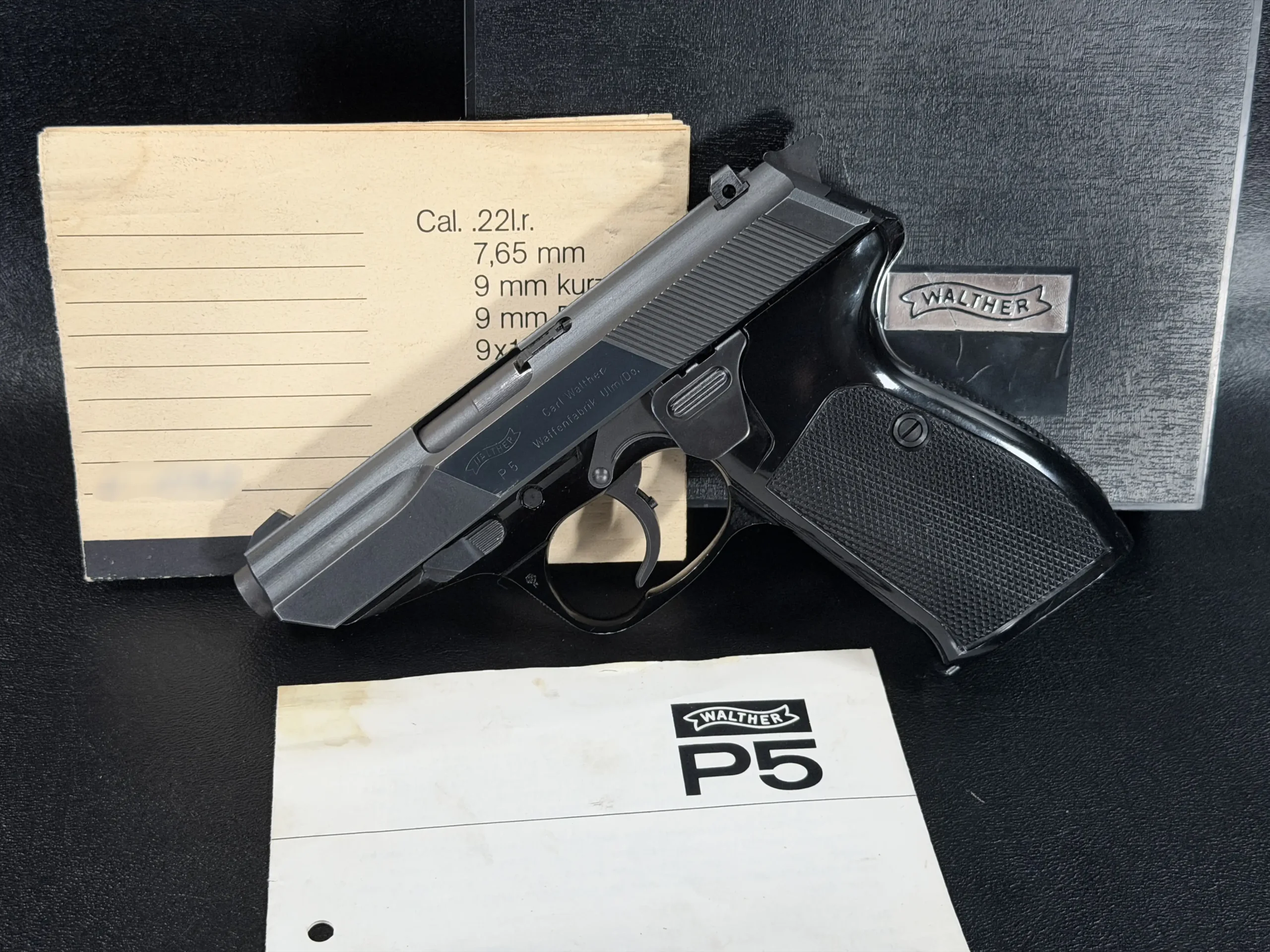 This pistol has the purposeful late-20th-century Walther appearance, with a matte-finished slide, black frame, checkered grips, and streamlined controls. Included with the pistol are a Walther P5 manual and a factory target marked for 25-meter testing.