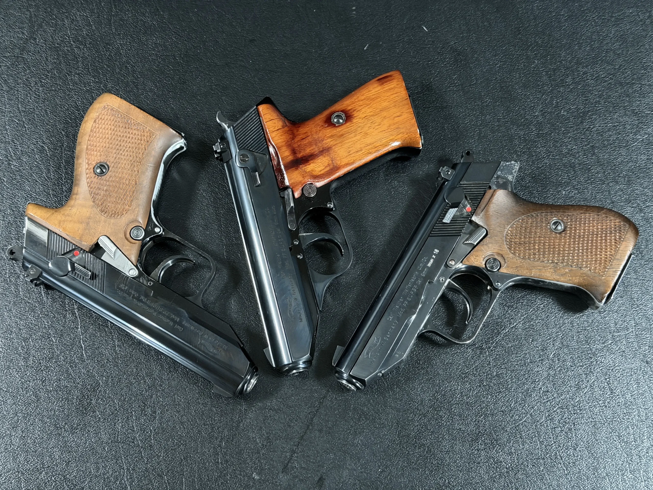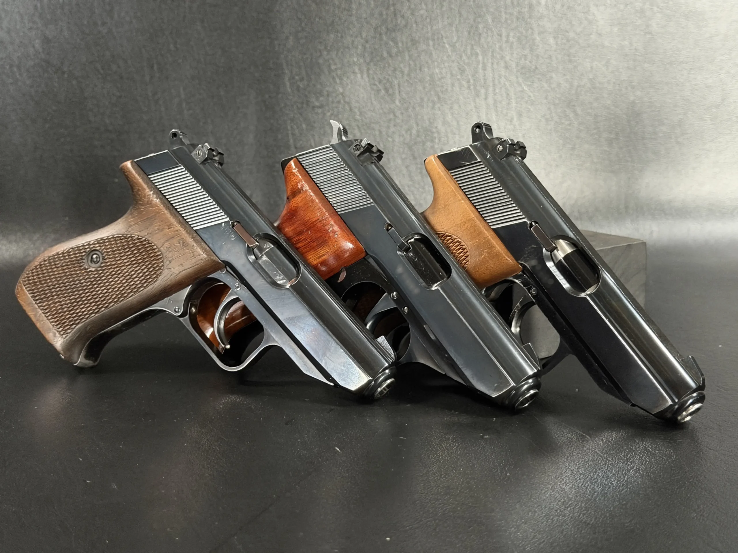 The group includes two pistols chambered in 9×18 and one chambered in 9mm Kurz (.380 ACP), reflecting two chamberings evaluated during the design process. As a set, they offer a direct look at the experimental path behind the PP Super and the engineering decisions that shaped the model.