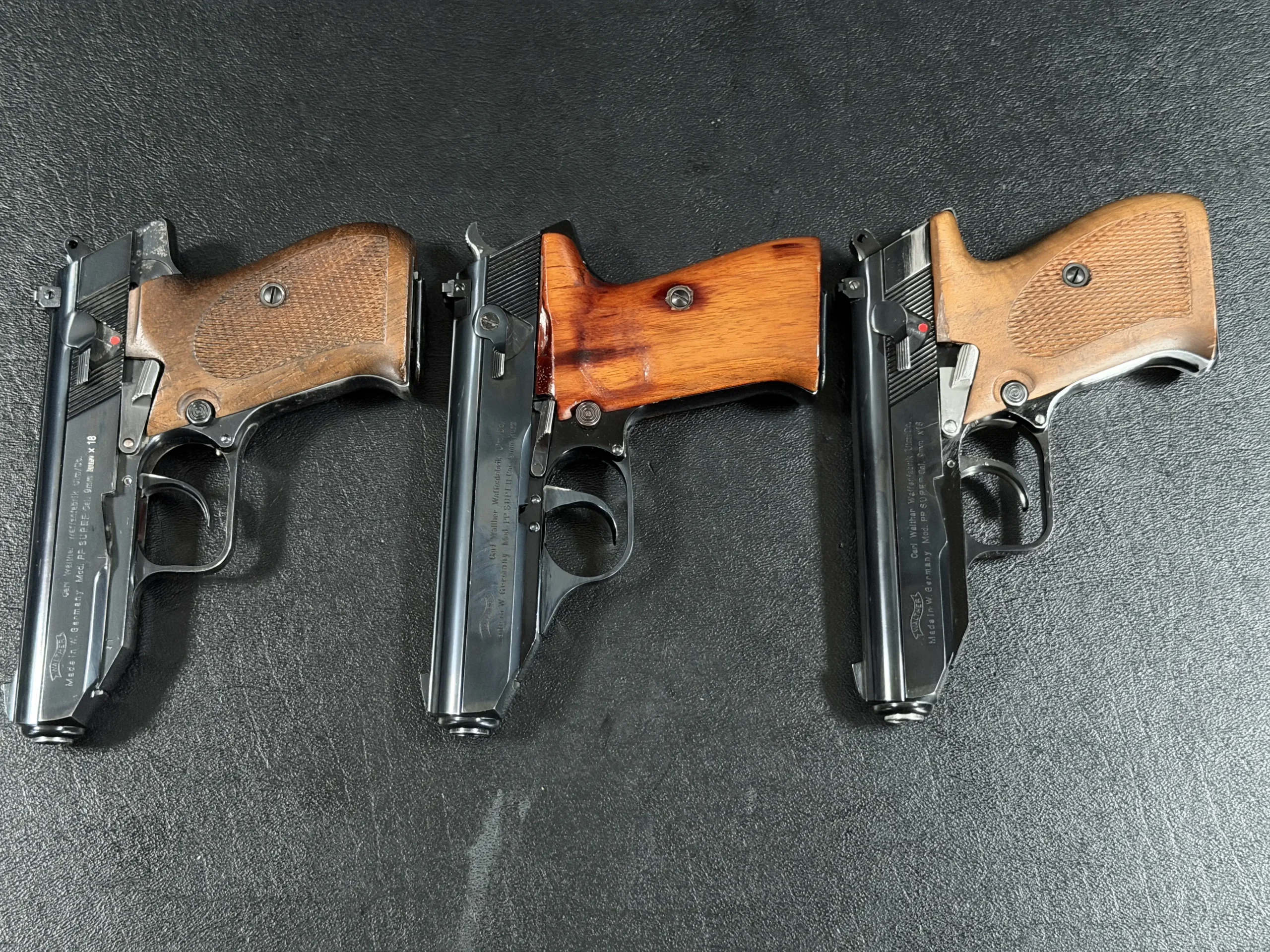 Details within the set further distinguish the individual prototypes. Two wear checkered brown grips, while the third is fitted with smooth wooden grip panels, giving each pistol a distinct appearance within the group.