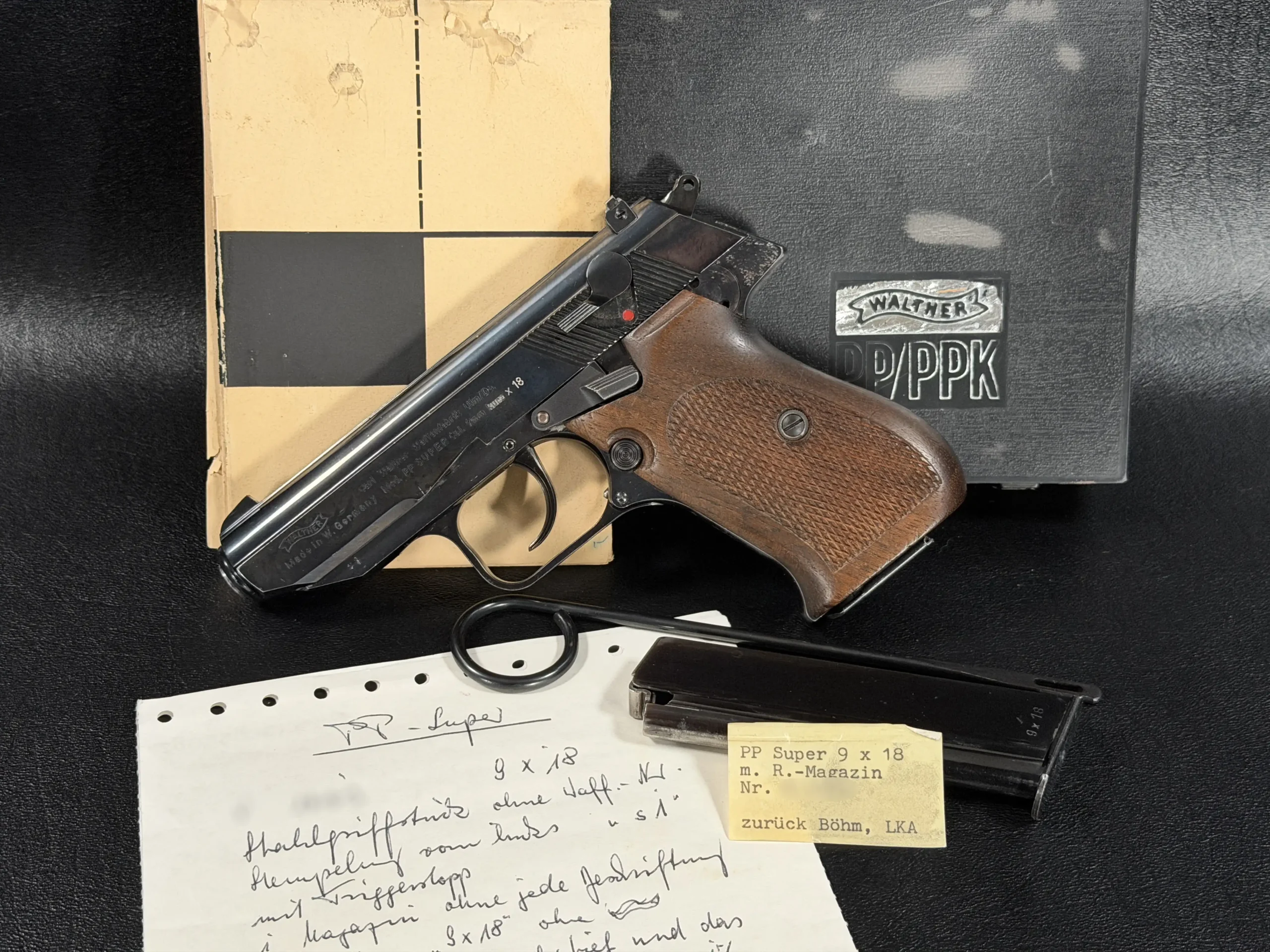 Also included are period accessories and documentation, with original packaging elements and handwritten technical notes that underscore the developmental nature of the set. For collectors interested in Walther design history and prototype firearms, this three-pistol group presents a focused and compelling snapshot of the PP Super’s development.