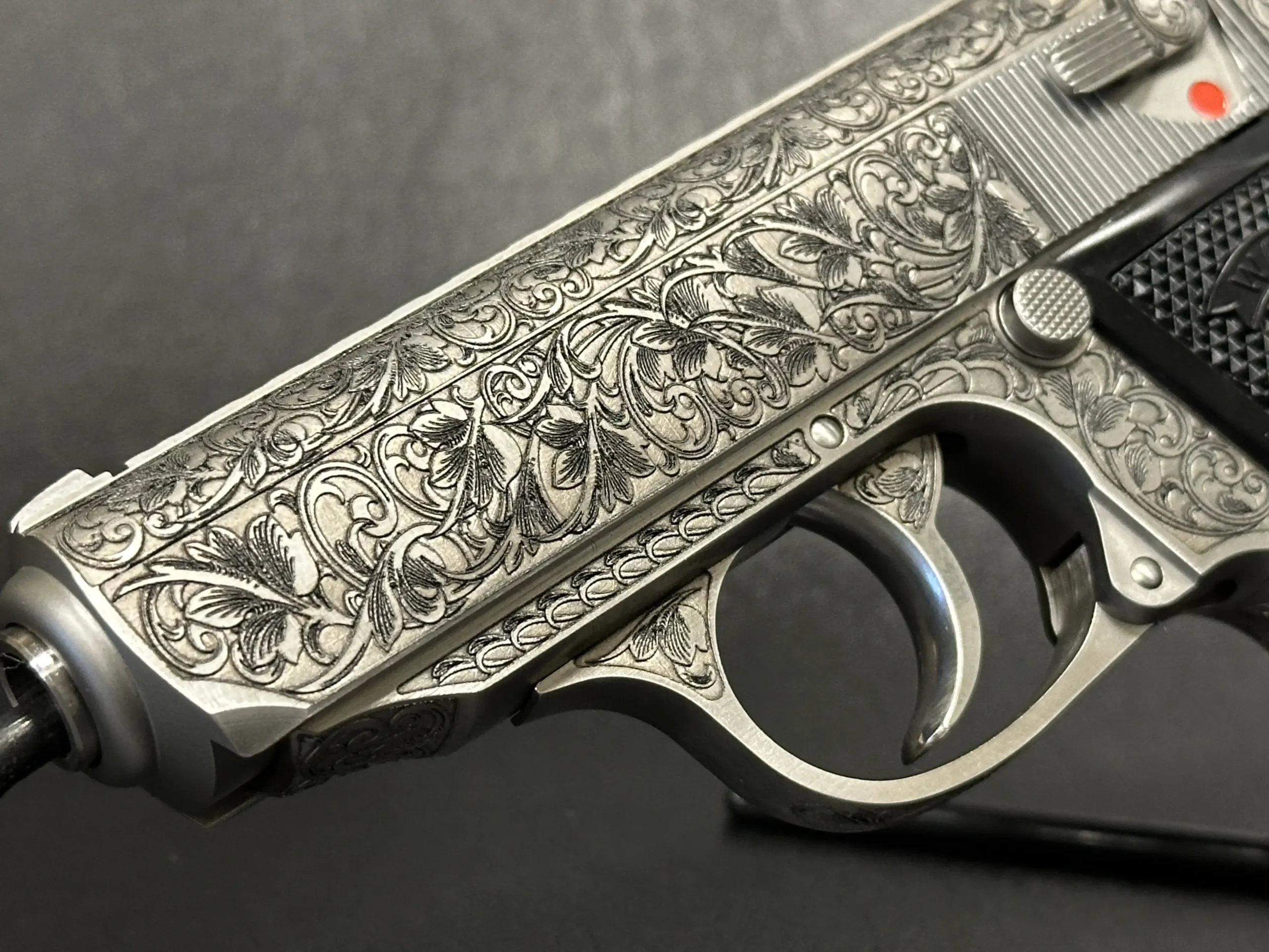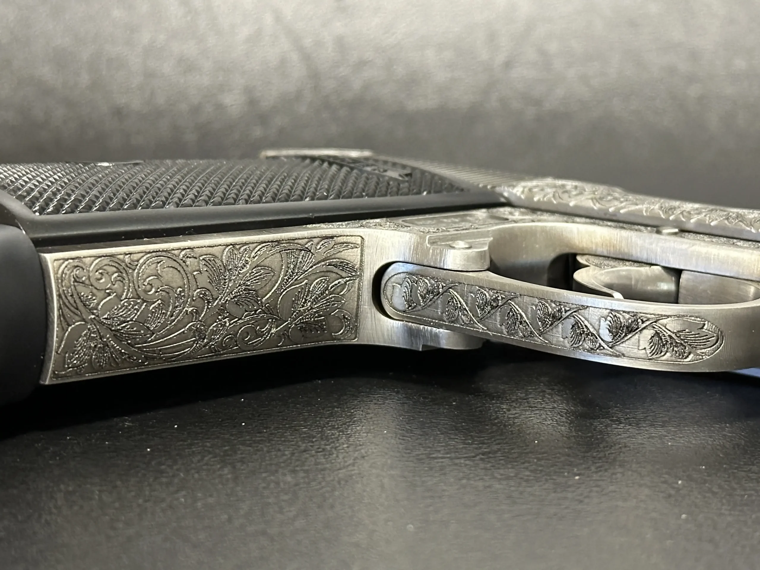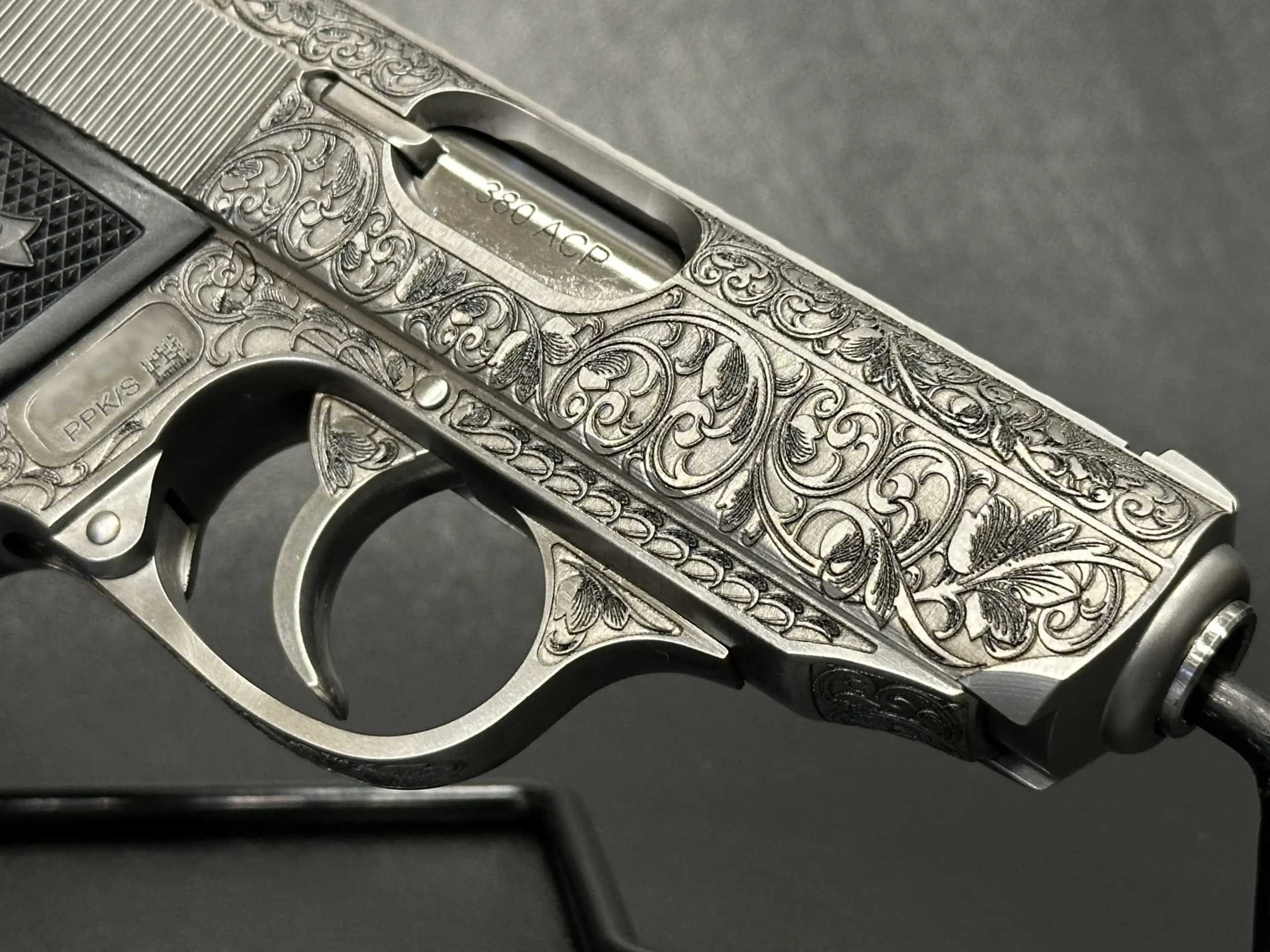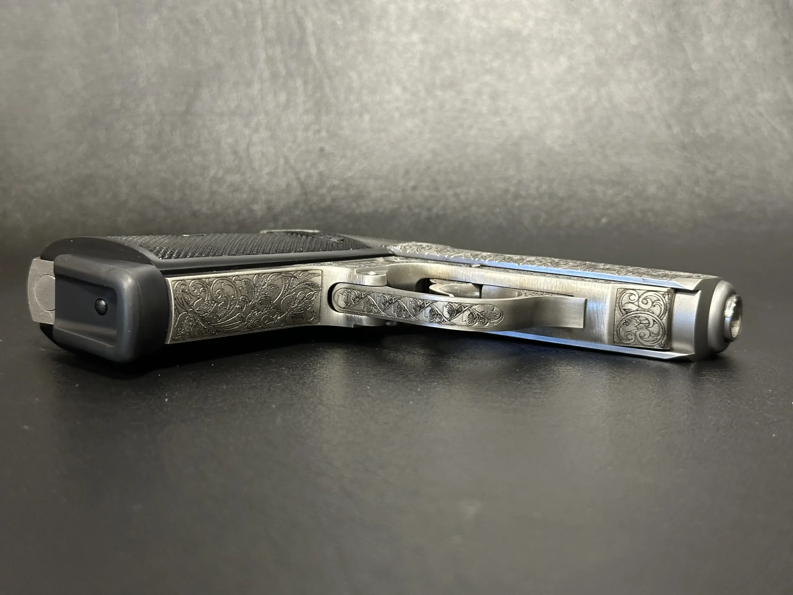 This pistol has been enhanced by DF Arms with laser engraving across the slide and frame in flowing scrollwork. The engraving complements the classic lines of the Walther PPK/S while adding a more elevated, display-ready look.