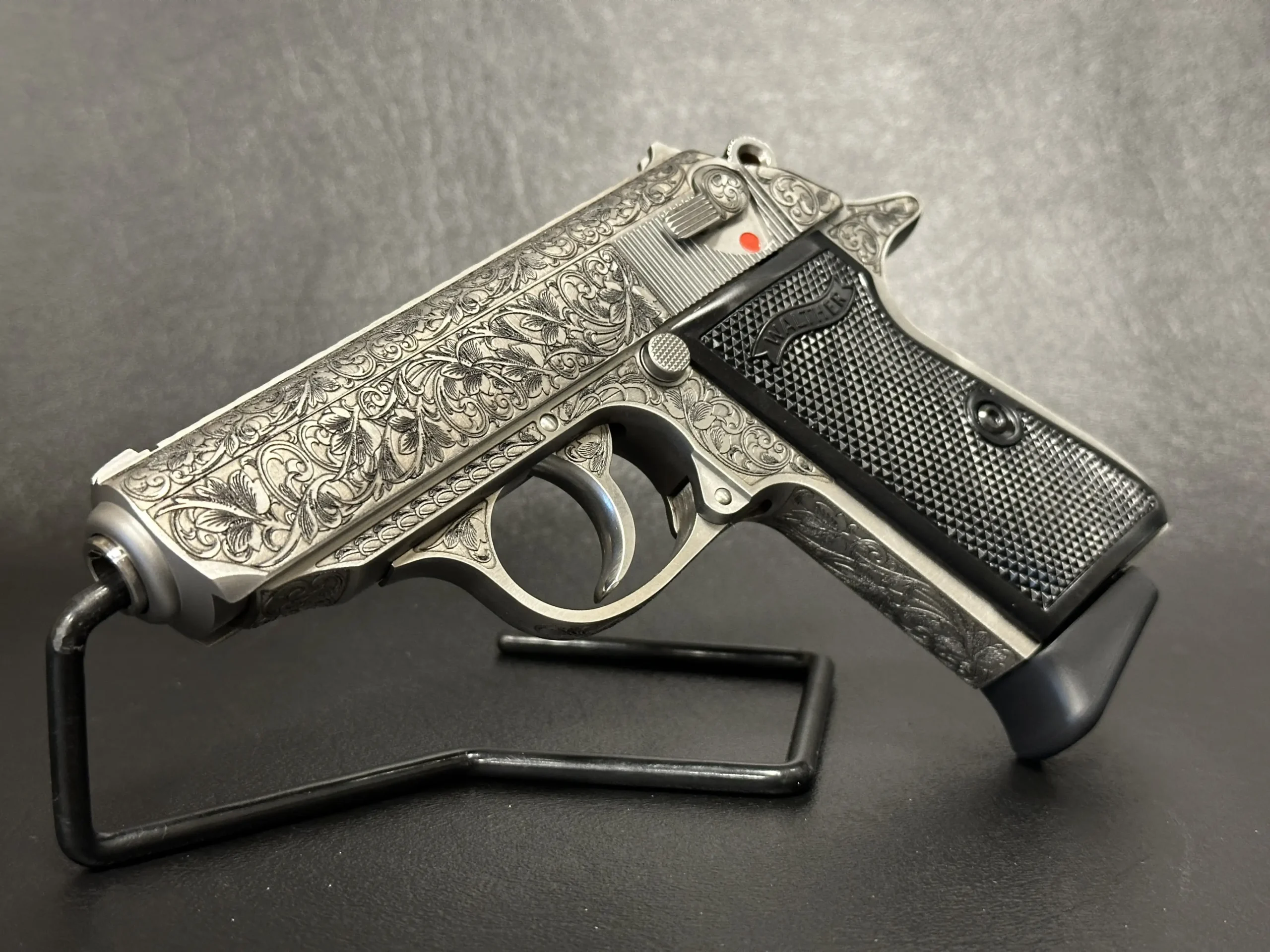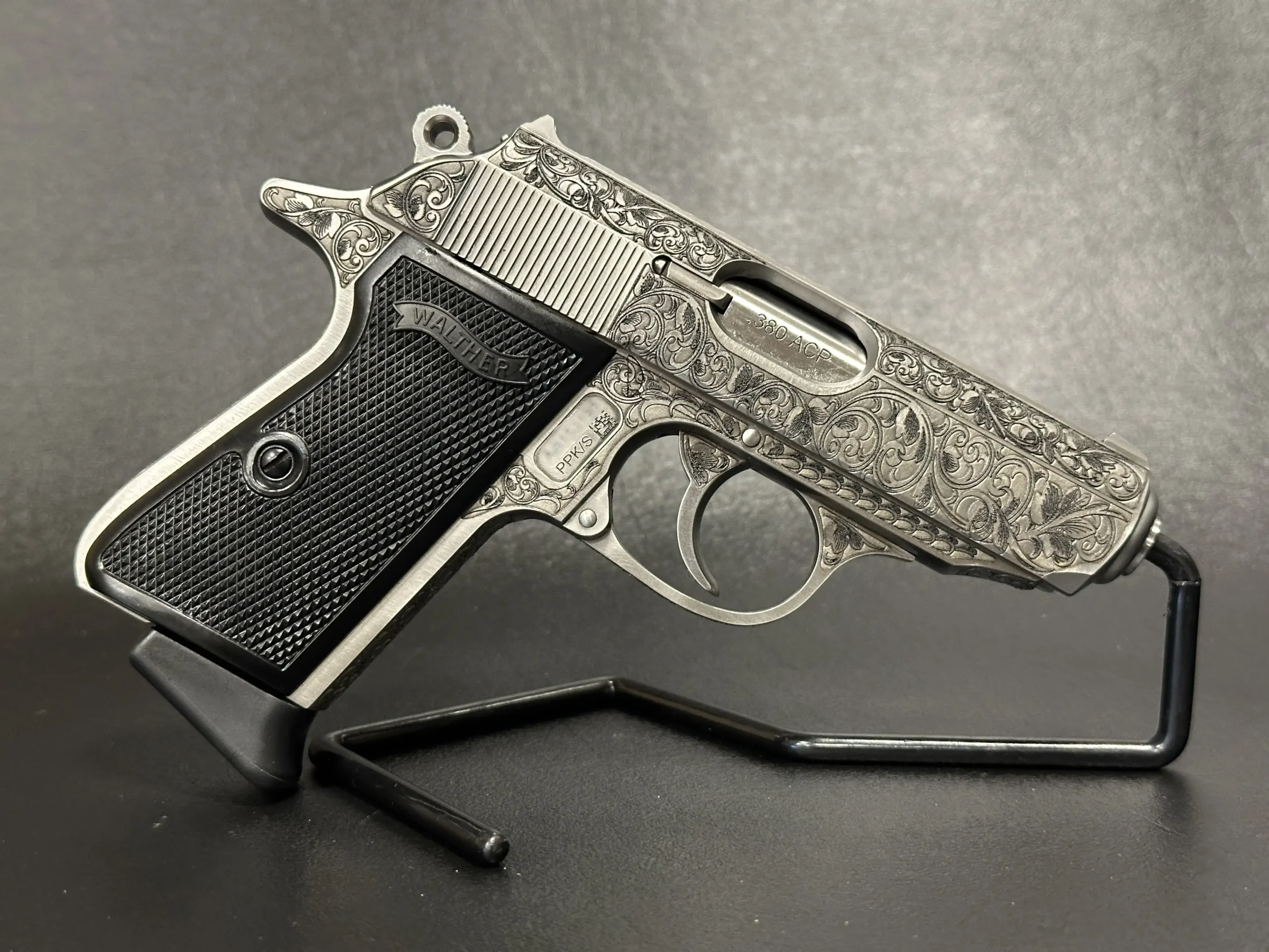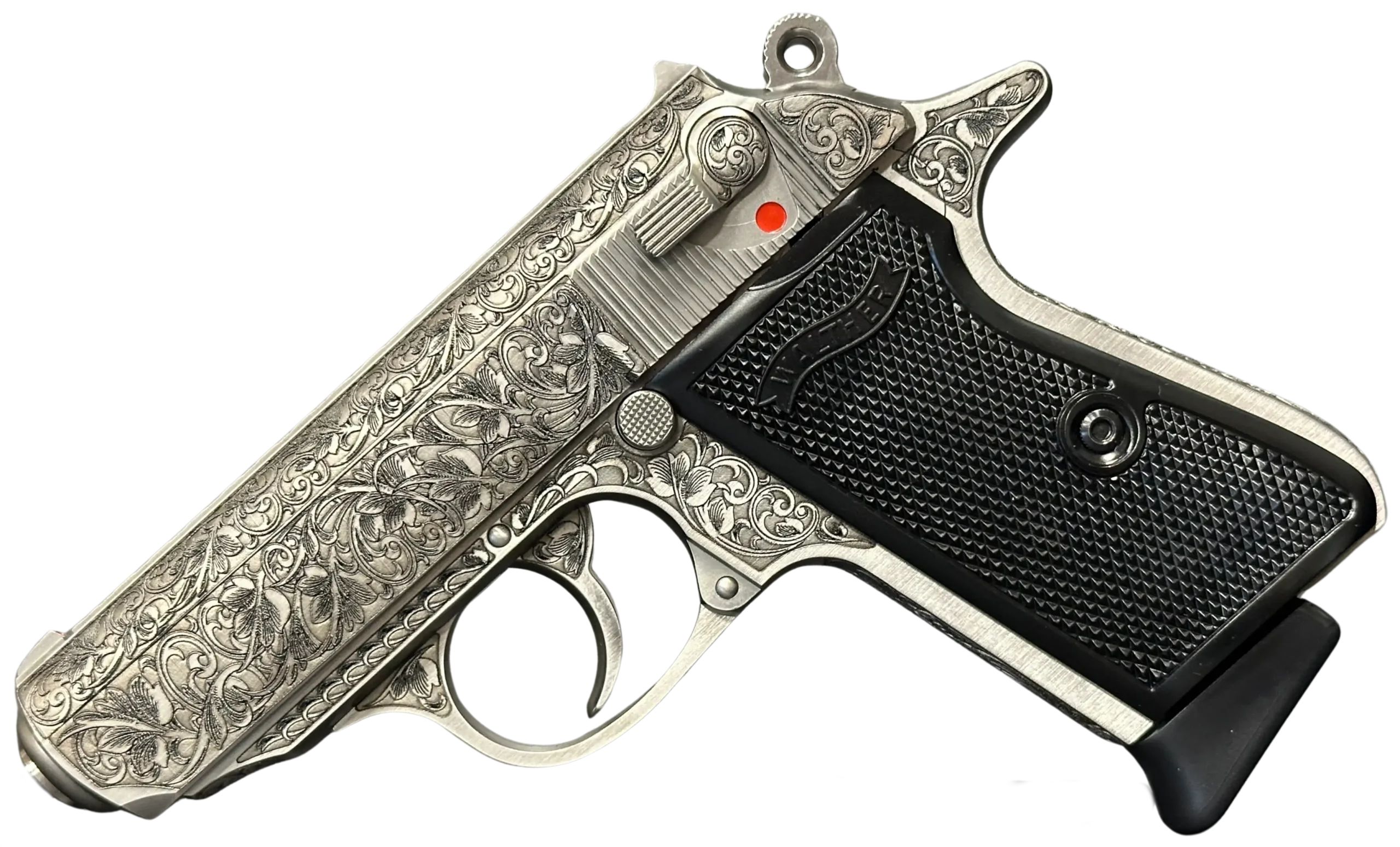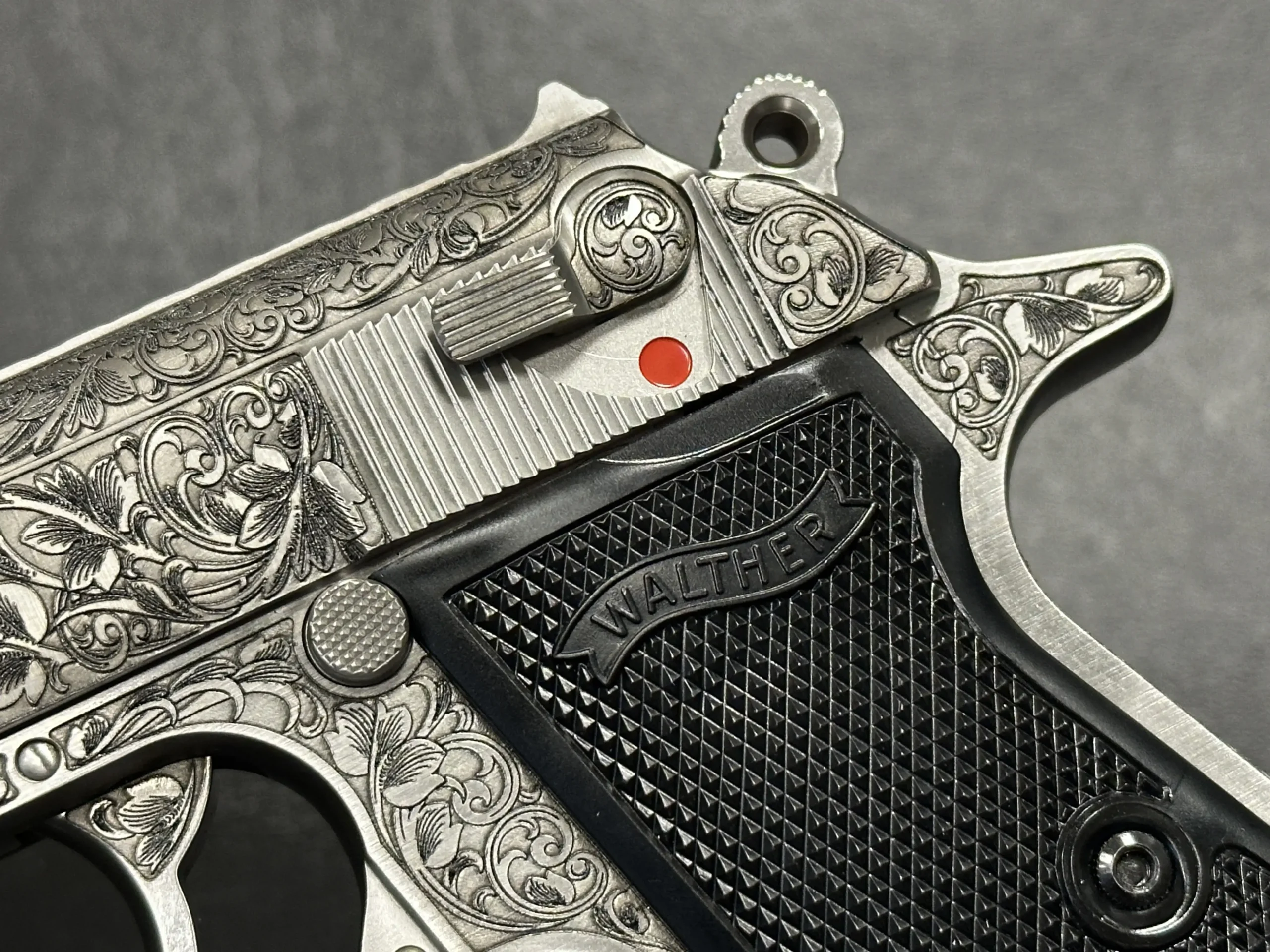 This pistol has been enhanced by DF Arms with laser engraving across the slide and frame in flowing scrollwork. The engraving complements the classic lines of the Walther PPK/S while adding a more elevated, display-ready look.