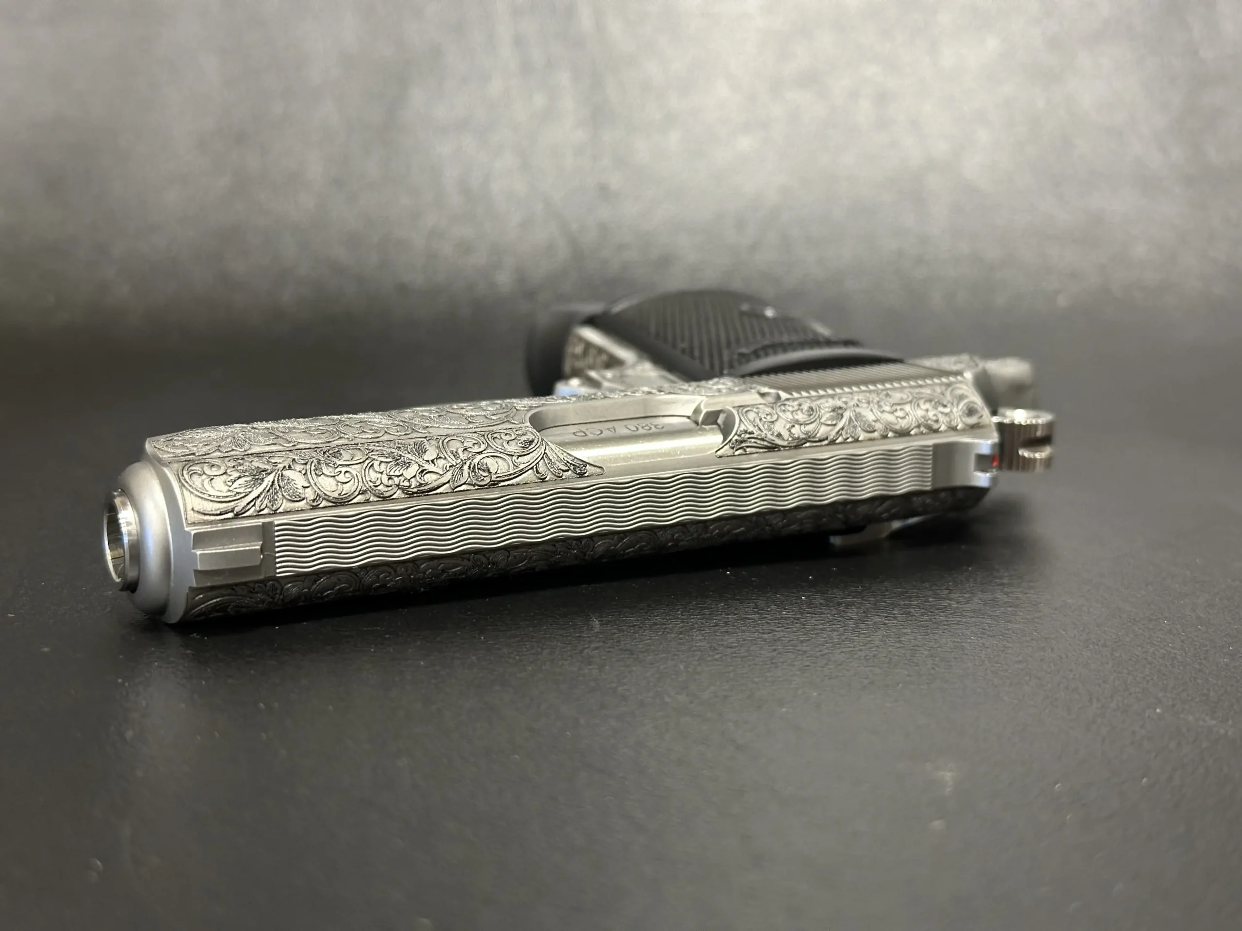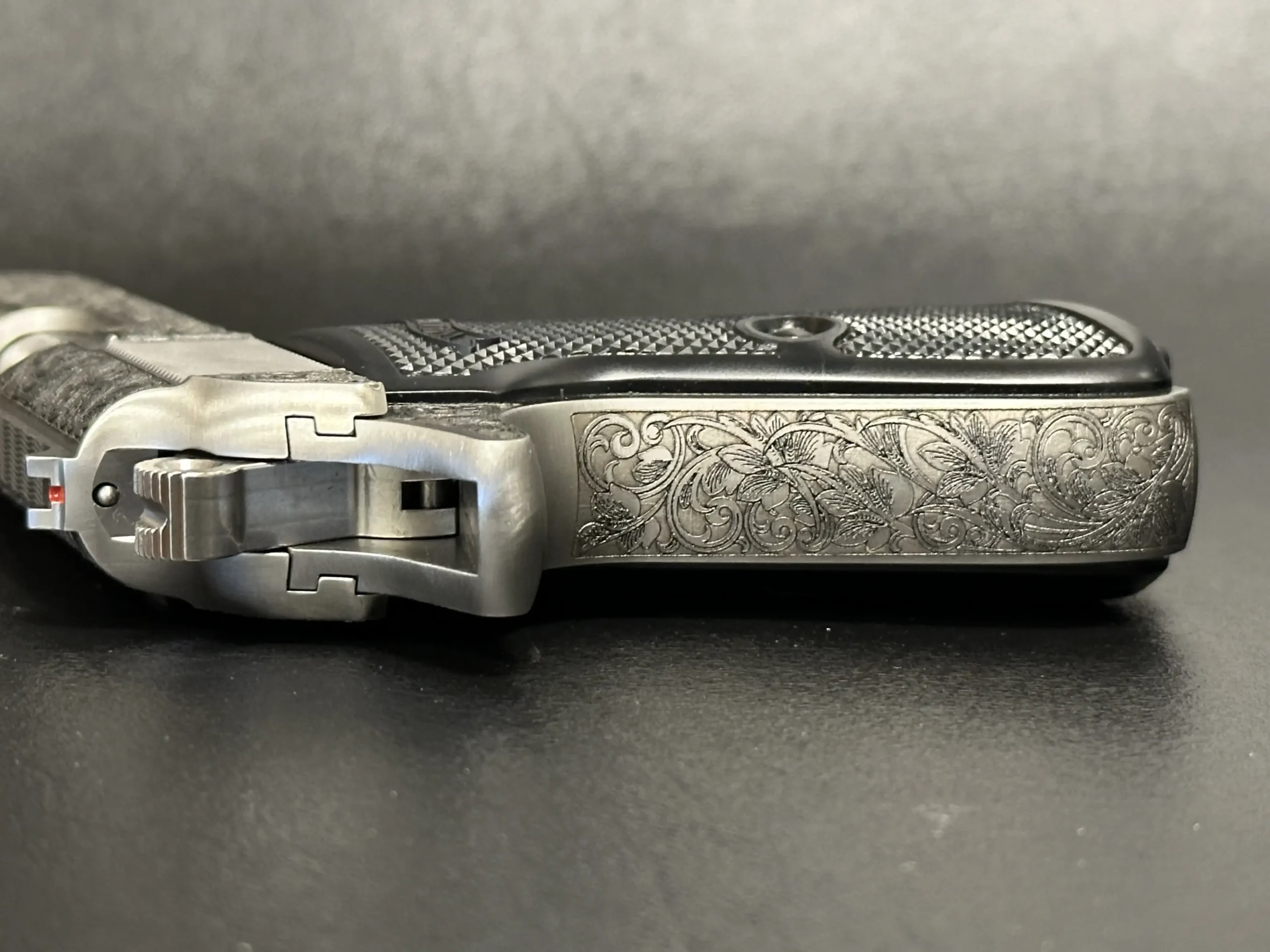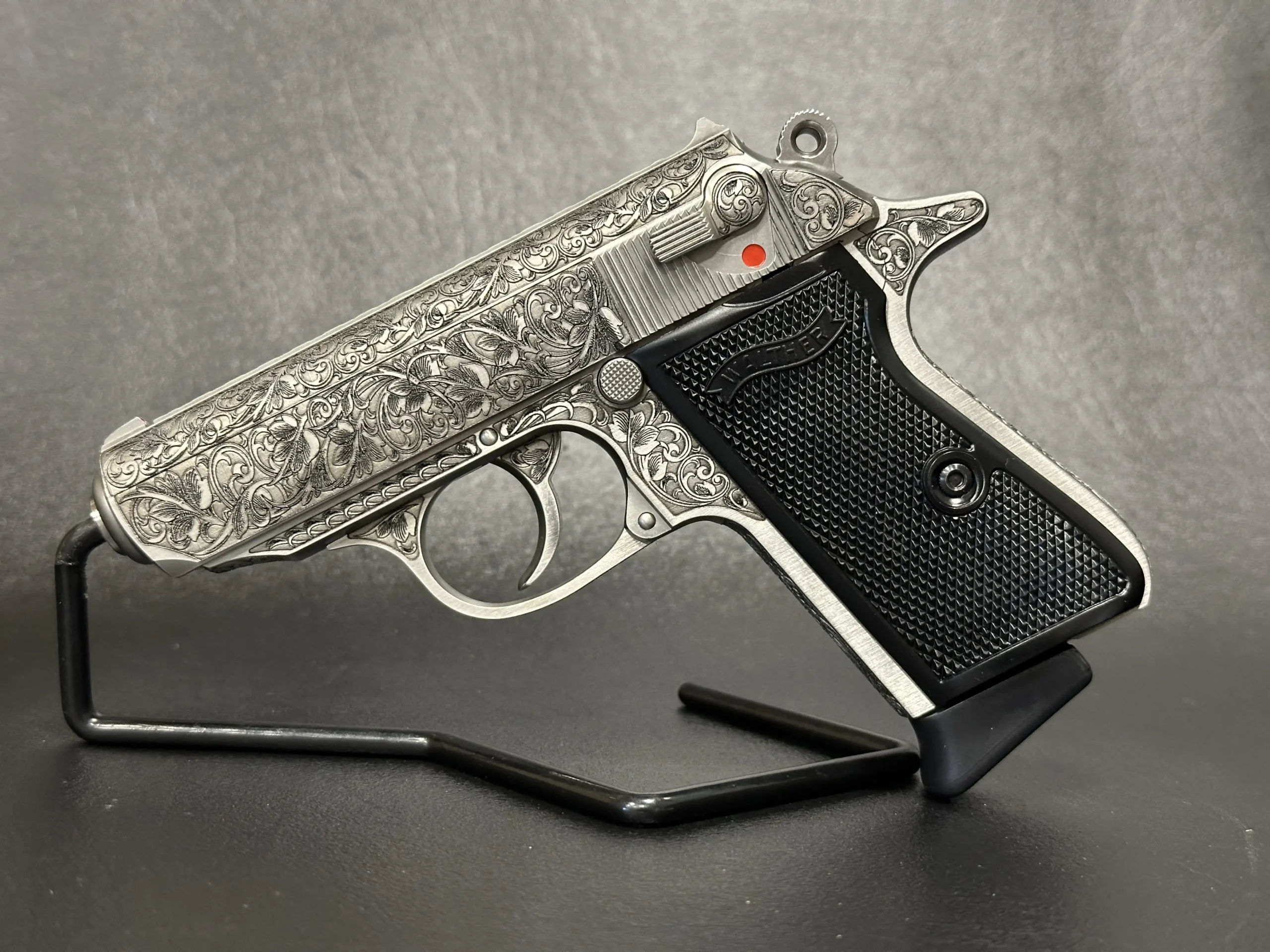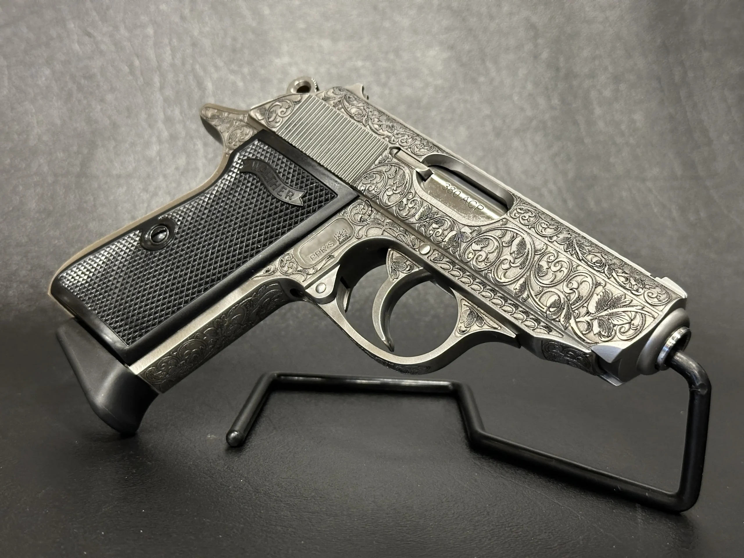 This pistol has been enhanced by DF Arms with laser engraving across the slide and frame in flowing scrollwork. The engraving complements the classic lines of the Walther PPK/S while adding a more elevated, display-ready look.